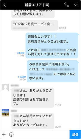 LINE WORKS is not just used as a means of contact, but it is also used as a tool which enables all the employees to communicate better and even helps motivate one another. We can share tips, including increasing the consumer purchase rate, decorating the front desk, and operating know-hows of other stores, that are helpful in terms of increasing consumer satisfaction.