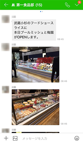 LINE WORKS is convenient because we can also share information in real time when inspecting stores in local communities. Being able to share photos of progress with cases of remodeling enabled us to send and receive more accurate and detailed information. Furthermore, since I am in charge of confectionery, I made a group with those who are in charge of side dishes and we could share opinions with one another. In the sake of spreading motivation throughout the team members, we either share success stories or improvements that need to be made. At times, store managers even share their own opinions about the store.