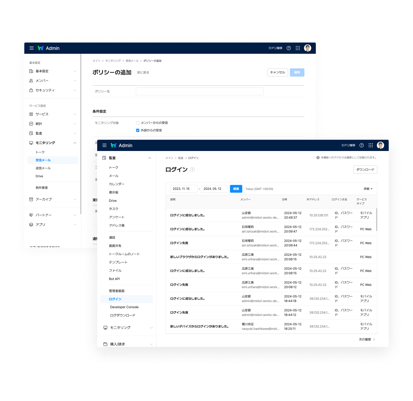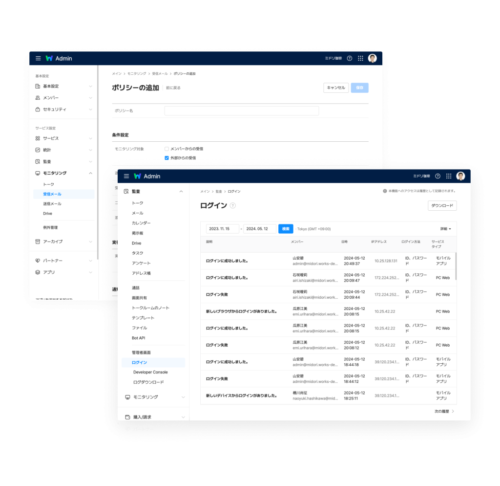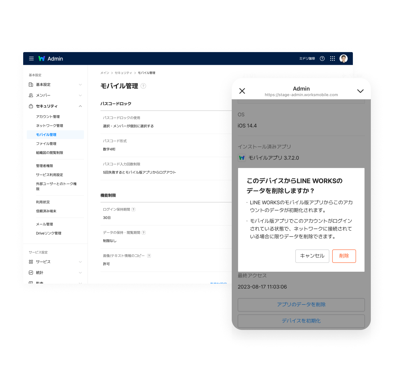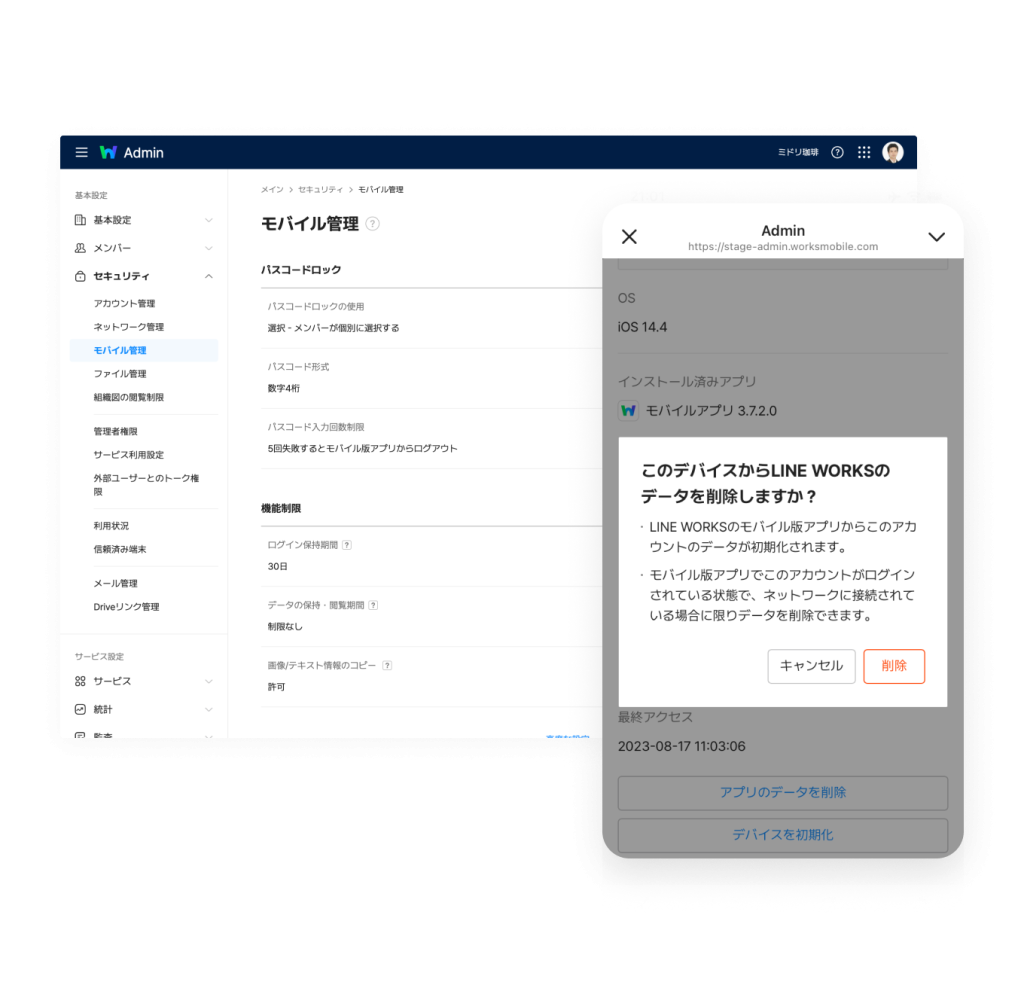 管理 管理 多彩な機能で様々な利用環境の管理をサポート フリー スタンダード アドバンスト トーク 掲示板 カレンダー タスク アンケート アドレス帳 メール Drive 管理 Bot Menu トーク 掲示板 カレンダー タスク アンケート アドレス帳 メール Drive 管理 Bot Team management メンバーや組織を一括管理 組織階層や役職、兼務の設定など、日本の企業文化に最適化された機能構成で社内システムとしての管理が行なえます。メンバー情報の修正や権限付与など一部の機能は、モバイルからも設定可能です。 LINE WORKSを一緒に使いたいメンバーを招待する Data auditing トラブルにも安心の充実した監査・モニタリング機能 監査対象のサービスを選択してユーザーの利用履歴をモニタリングし、日時、作業内容、IPアドレス、送受信者等の条件で検索してログを確認できます。 グループの作り方 グループの作り方 Mobility management 遠隔制御など充実のセキュリティで遠隔制御など充実のセキュリティでモバイルからの利用も安心 スマートフォンの盗難・紛失時の遠隔データ削除や、LINE WORKSから端末へのファイル保存制限、外部MDMとの連携によって特定端末からのみのログイン許可など、スマートフォンからのサービス利用のためにも充実のセキュリティ機能を備えています。 建設業現場でLINE WORKS活用方法 Data archiving 最大10年保管できる 大容量アーカイブ 最大10年分のデータが安全に保管され、企業のコンプライアンス対策に必要なデータを簡単に探すことができます。 (オプション商品) その他の機能について その他の機能についてはサービス機能一覧をご参照ください。 LINE WORKSはスマートフォン側にデータを残さない設定にできるのも重要なポイントでした。幹部から、紛失したときに情報が漏れたらどうするのかという心配の声があがりましたが、管理画面にて「ファイルダウンロード制限機能」を有効にすることにより、閲覧は可能だがスマートフォン側にファイル保存を制限出来ることを説明することでその心配が解消されました。 インタビューをもっと見る 株式会社富士通パーソナルズ 八坂 一弘さん 関連情報 # ブログ シャドーITは氷山の一角 個人で使うツールを業務で使ってしまうことで、社外への誤送信や、スマホの紛失・盗難による誤送信、情報の持ち出しなど、シャドーITを放置することはセキュリティやコンプライアンスの観点で様々なリスクを抱えることになります。 # 導入事例 株式会社ケーイーシー シャドーITを防ぐだけでなく、より厳格な労務管理が可能になりました。学習塾を運営する社員と学生講師のスピーディな意志疎通を実現。 # 導入事例 株式会社スズキリファイン アルバイトスタッフが100人を超えたのを機に、登録データの一括編集機能を備え、管理者向けの機能もより充実しているライトプランに切り替えました。 今すぐ無料ではじめよう!