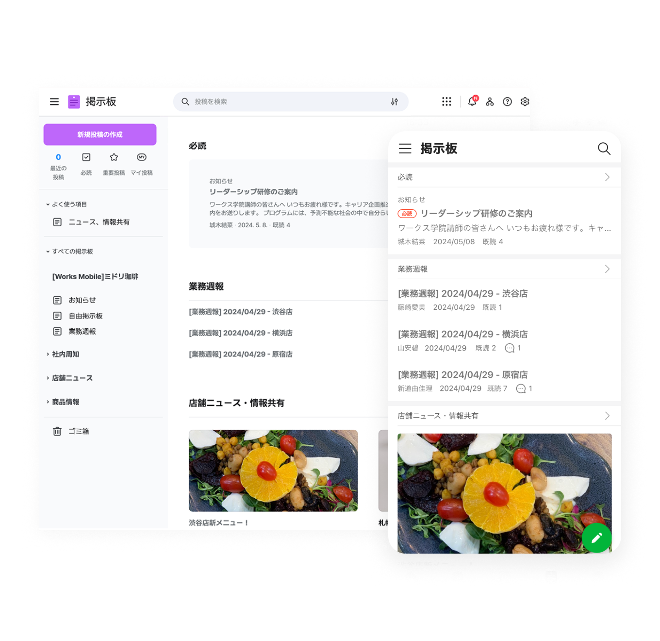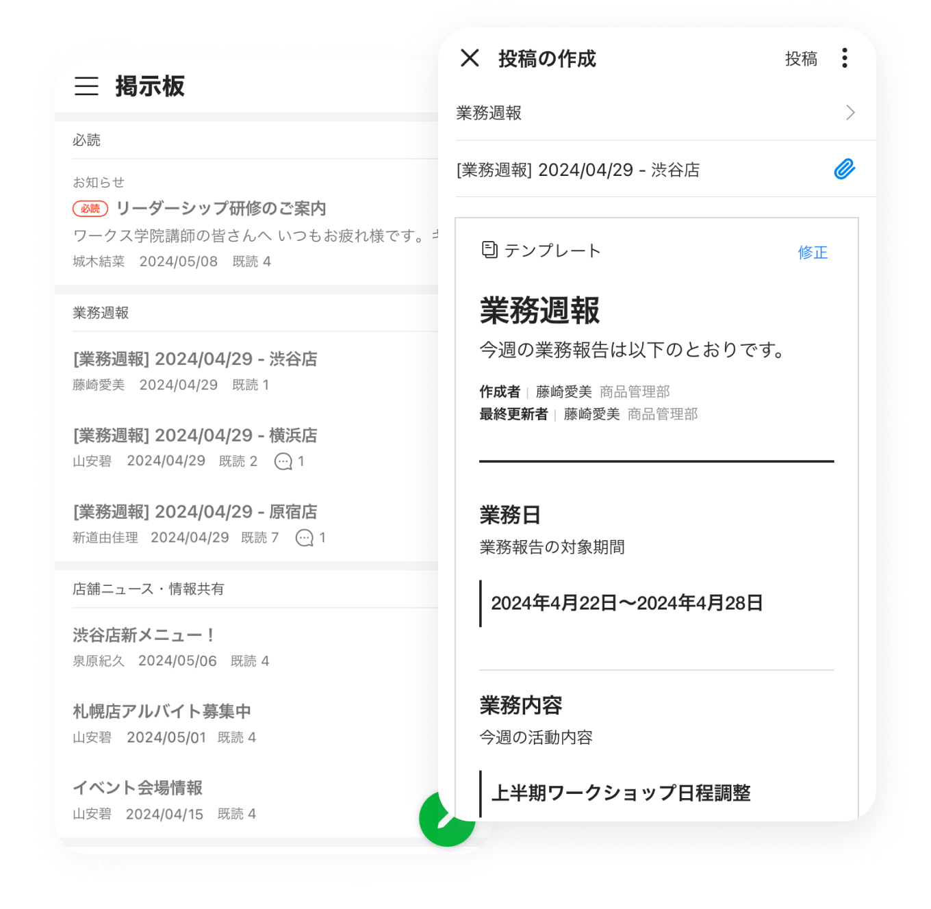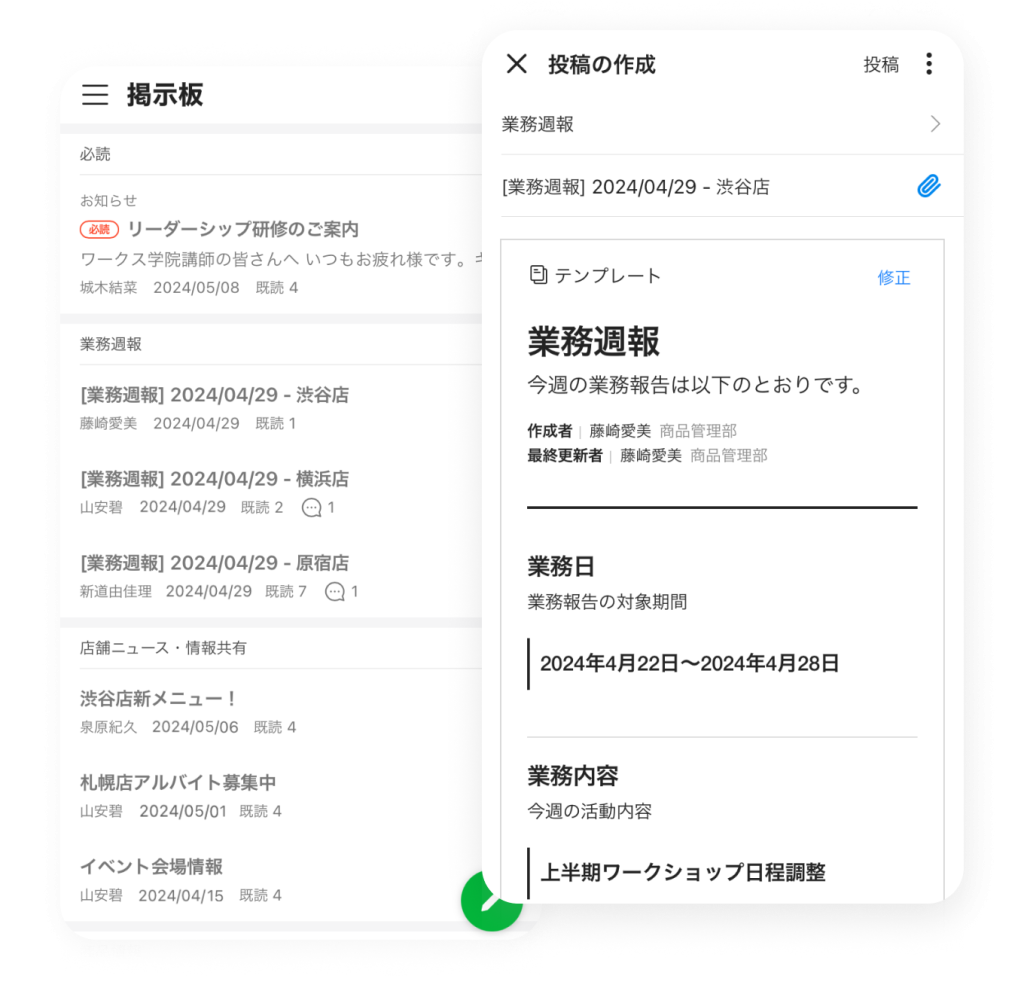 掲示板 掲示板 大事な周知や情報共有も徹底できる掲示板 フリー スタンダード アドバンスト トーク 掲示板 カレンダー タスク アンケート アドレス帳 メール Drive 管理 Bot Menu トーク 掲示板 カレンダー タスク アンケート アドレス帳 メール Drive 管理 Bot Information sharing いつでも見れる掲示板機能で一括周知 チャットやメールなどでは見逃しがちな情報も掲示板を使えば、メンバーはいつでも確認できます。管理者は用途に合わせて掲示板別に閲覧・編集権限を設定でき、特定の範囲内での情報共有にも有用です。 掲示板を活用した効率的な情報共有で、ビジネスを伸ばす Easy Posting 充実した投稿方法 ファイル添付はもちろん、画像/動画の本文挿入、簡単に投稿できるテンプレート機能など豊富な作成方法で投稿できます。また、予約投稿や下書き保存の機能で、スキマ時間を利用した投稿も可能です。 報告書を手軽に作成!テンプレートを活用する4つの方法 Reminder 見逃しや確認漏れを防止 プッシュ通知、必読設定、既読メンバー確認や再通知、コメントでのメンションの機能を使って周知も徹底できます。投稿はタイトル、本文、作成者で検索でき、必要な情報も簡単に探せます。 薬局で掲示板を活用する方法 その他の機能について その他の機能についてはサービス機能一覧をご参照ください。 今までメールで共有していた日報をLINE WORKSで共有することになりました。すると誰かの日報に対してみんなが気軽にコメントやアドバイスを発信するようになり、職員同士のコミュニケーションが深まりました。メールで共有していたときに比べると、LINE WORKS ではコメントがつく割合が3~4倍増えました。 インタビューをもっと見る 認定NPO法人カタリバ 岩澤さん 関連情報 # ブログ 感染症対策の情報を社内メンバーに周知徹底する方法 2020年1月30日、LINE WORKSのユーザー向けカンファレンス「2020 LINE WORKS DAY」を開催いたしました! # 導入事例 株式会社東ハト 営業統括本部では、全営業社員に向けた通達事項に加え、各商品の販売実績や販促キャンペーン、生産計画などに関する最新の情報をホームにアップするようになりました。 # ブログ LINE WORKSで安否確認する3つの方法と活用例 災害の対応というのは、実は発生後に安否確認を実施するだけではありません。台風など事前に来ることが予想される場合、 今すぐ無料ではじめよう!