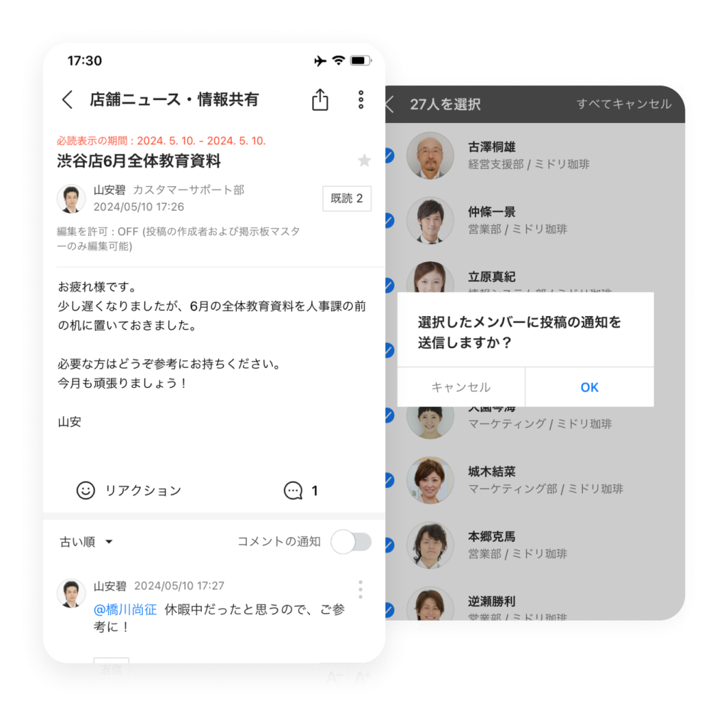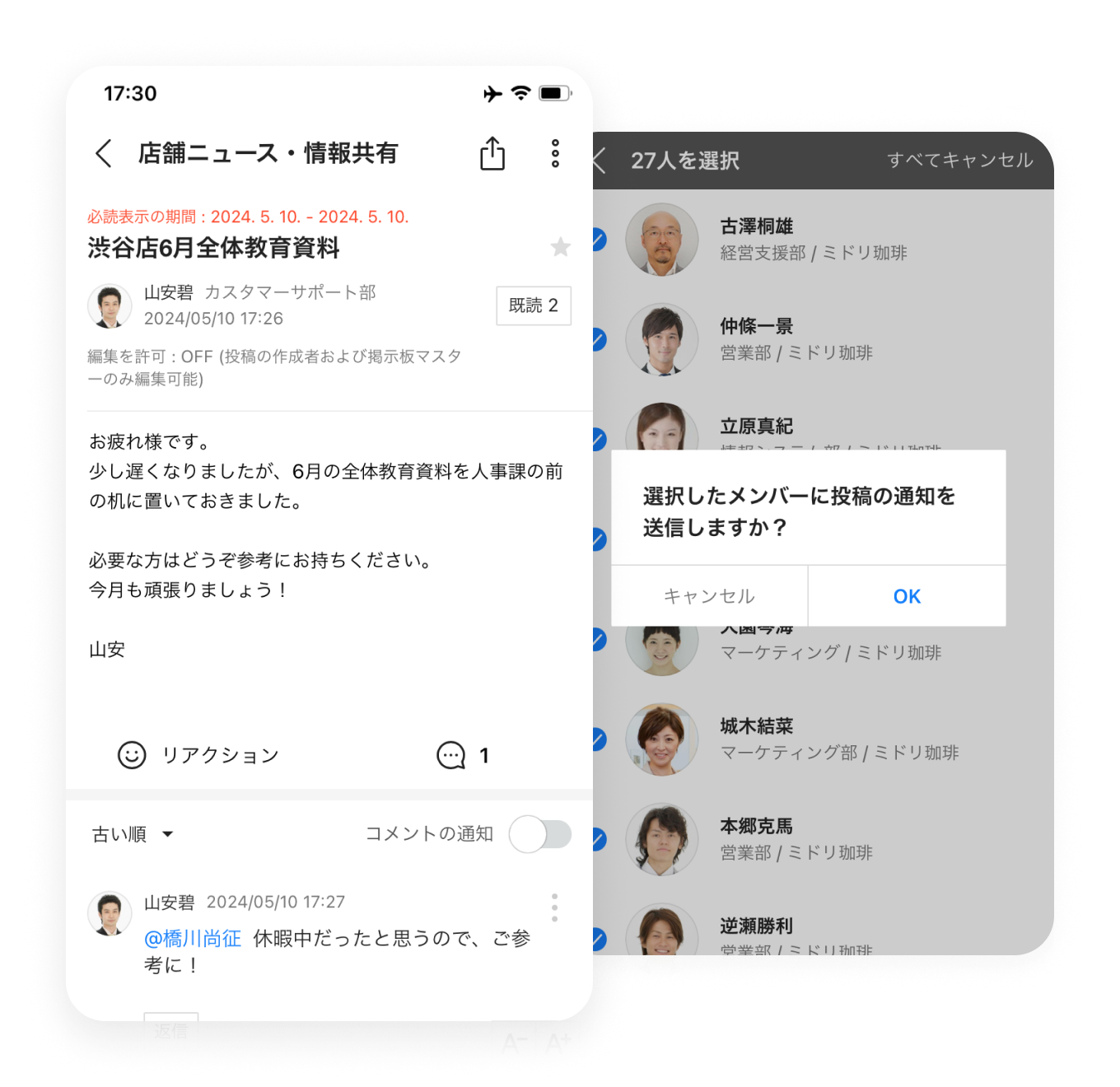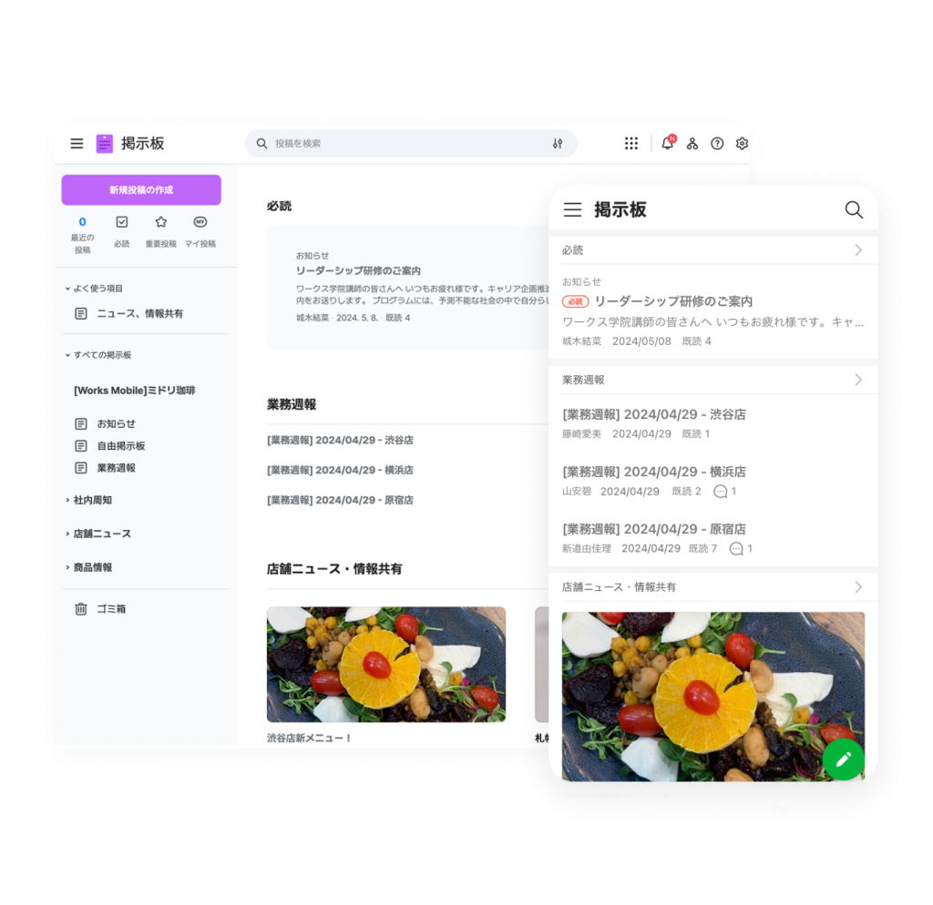 掲示板 掲示板 大事な周知や情報共有も徹底できる掲示板 フリー スタンダード アドバンスト トーク 掲示板 カレンダー タスク アンケート アドレス帳 メール Drive 管理 Bot Menu トーク 掲示板 カレンダー タスク アンケート アドレス帳 メール Drive 管理 Bot Information sharing いつでも見れる掲示板機能で一括周知 チャットやメールなどでは見逃しがちな情報も掲示板を使えば、メンバーはいつでも確認できます。管理者は用途に合わせて掲示板別に閲覧・編集権限を設定でき、特定の範囲内での情報共有にも有用です。 掲示板を活用した効率的な情報共有で、ビジネスを伸ばす Easy Posting 充実した投稿方法 ファイル添付はもちろん、画像/動画の本文挿入、簡単に投稿できるテンプレート機能など豊富な作成方法で投稿できます。また、予約投稿や下書き保存の機能で、スキマ時間を利用した投稿も可能です。 報告書を手軽に作成!テンプレートを活用する4つの方法 Reminder 見逃しや確認漏れを防止 プッシュ通知、必読設定、既読メンバー確認や再通知、コメントでのメンションの機能を使って周知も徹底できます。投稿はタイトル、本文、作成者で検索でき、必要な情報も簡単に探せます。 薬局で掲示板を活用する方法 その他の機能について その他の機能についてはサービス機能一覧をご参照ください。 今までメールで共有していた日報をLINE WORKSで共有することになりました。すると誰かの日報に対してみんなが気軽にコメントやアドバイスを発信するようになり、職員同士のコミュニケーションが深まりました。メールで共有していたときに比べると、LINE WORKS ではコメントがつく割合が3~4倍増えました。 インタビューをもっと見る 認定NPO法人カタリバ 岩澤さん 関連情報 # ブログ 感染症対策の情報を社内メンバーに周知徹底する方法 2020年1月30日、LINE WORKSのユーザー向けカンファレンス「2020 LINE WORKS DAY」を開催いたしました! # 導入事例 株式会社東ハト 営業統括本部では、全営業社員に向けた通達事項に加え、各商品の販売実績や販促キャンペーン、生産計画などに関する最新の情報をホームにアップするようになりました。 # ブログ LINE WORKSで安否確認する3つの方法と活用例 災害の対応というのは、実は発生後に安否確認を実施するだけではありません。台風など事前に来ることが予想される場合、 今すぐ無料ではじめよう!