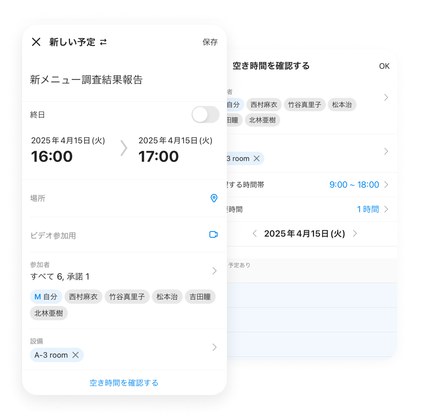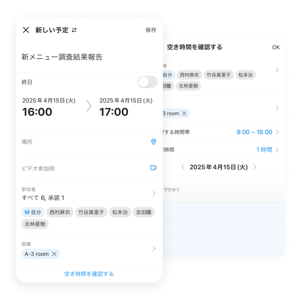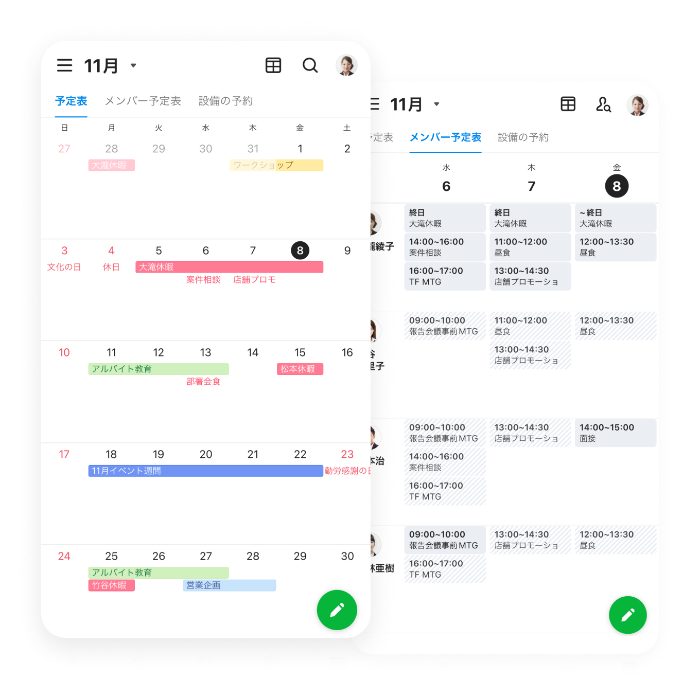カレンダー カレンダー 空き時間の確認から予定作成までスムーズに フリー スタンダード アドバンスト トーク 掲示板 カレンダー タスク アンケート アドレス帳 メール Drive 管理 Bot Menu トーク 掲示板 カレンダー タスク アンケート アドレス帳 メール Drive 管理 Bot Team Calendar 他のメンバーの予定も把握できる PCでもスマートフォンからでも個人の予定だけでなく、他のメンバーの予定も確認できます。所属組織に限らず、社内のどのメンバーのスケジュール確認も簡単に行なえます。 会社内のスケジュール管理、可視化する方法 Smart Scheduling 効率的なスケジュール管理 予定にメンバーを招待する際も、空き時間の検索機能で適切な日時を簡単に探せます。定例会議やイベントなどは繰り返しで作成でき、プッシュ通知の設定で重要な予定も自分にリマインドできます。 グループの作り方 グループの作り方 Resource management 共用設備や備品の予約管理も 会議室や社内備品なども共有設備として登録しておけば、各メンバーが予定作成時に、その時間帯に利用可能な設備を設定できるため、社内設備の予約管理も自動化できます。 会議室や施設、設備利用予定の管理方法 その他の機能について その他の機能についてはサービス機能一覧をご参照ください。 LINE WORKS導入前、社員のスケジュールは、事務所にある紙の一週間のスケジュール表に簡単に記入する方式で行っていました。LINE WORKSを導入してデジタル化したことで、「書く」という手間や紙代のコストを削減できましたし、各担当者の詳細な居場所などもわかるので、すぐに連絡ができるようになりました。 インタビューをもっと見る 有限会社紀洲風呂 小原社長 関連情報 # 導入事例 株式会社たけや製パン LINE WORKSのカレンダー機能で共有されれば、リアルタイムに各人のスケジュールを把握できるので、かなりの業務効率化が図れると思います。 # ブログ LINE WORKSのカレンダーを活用して、顧客訪問活動を効率化 「社員の予定を横並びで確認できるのが良かった」誰がどこにいるのかスマホ1つですぐにわかるようになった。 # 導入事例 株式会社blanc 別のカレンダーアプリを開くことなく、チャットとカレンダーを同一のツールで使えるようになったことは、全社員の業務効率化に貢献してくれています。 今すぐ無料ではじめよう!