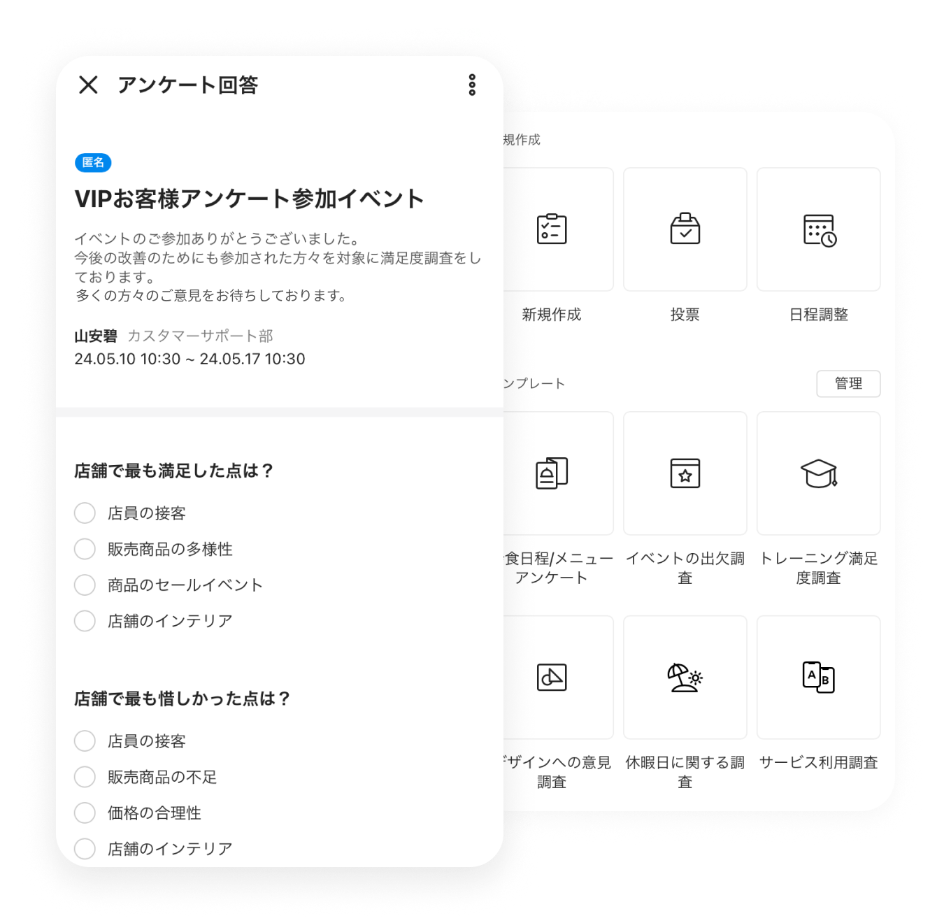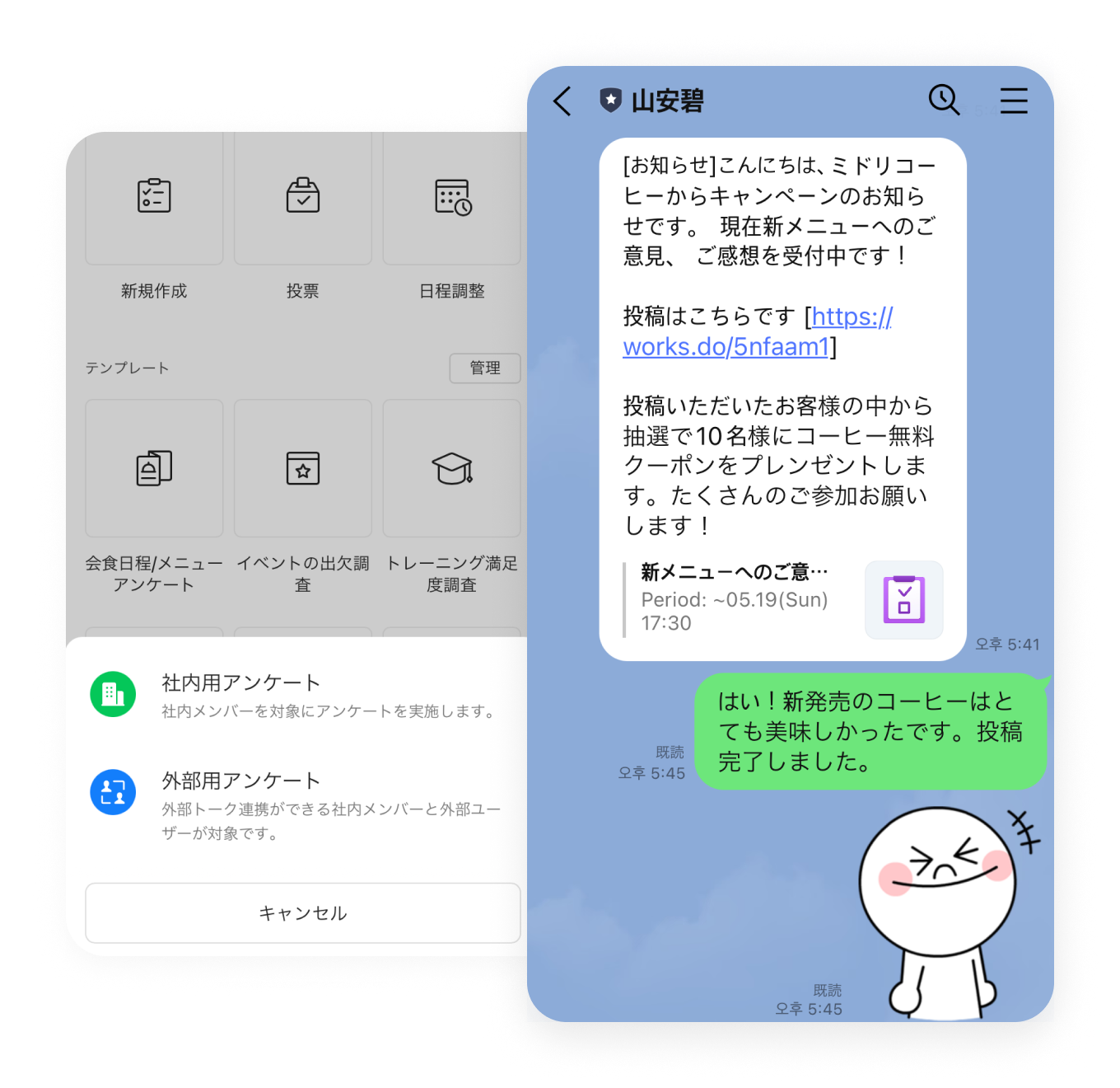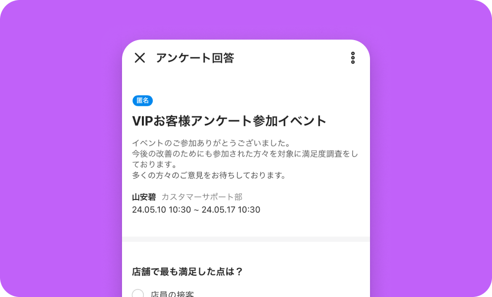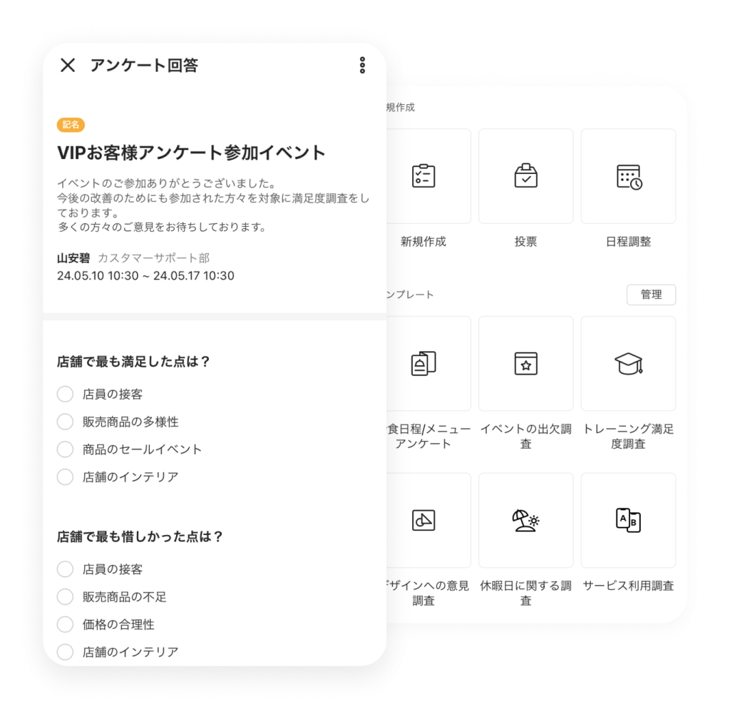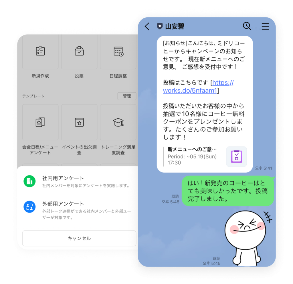 アンケート アンケート 意識調査や社内イベントの出欠確認もカンタンに フリー スタンダード アドバンスト トーク 掲示板 カレンダー タスク アンケート アドレス帳 メール Drive 管理 Bot Menu トーク 掲示板 カレンダー タスク アンケート アドレス帳 メール Drive 管理 Bot Survey templates 様々なシーンに対応した豊富なテンプレート 会食日程の調整から災害時の安否確認まで、すぐにアンケートを作成できるよう豊富なテンプレートがあらかじめ用意されています。 LINE WORKSを一緒に使いたいメンバーを招待する Survey anyone, anytime 顧客や取引先へもアンケートを実施 社内だけでなく、LINEユーザーや他社のLINE WORKSユーザーへもアンケートを実施できるため、顧客や取引先への意見調査等も行なえます。 グループの作り方 グループの作り方 Auto survey result analysis 回答結果はグラフで自動集計 メンバーの回答は表やグラフで自動的に集計され、結果をひと目で確認できます。回答結果をCSVなどのファイルでダウンロードすることもできます。 アンケートを活用し、業務負荷を大きく低減させた活用事例 その他の機能について その他の機能についてはサービス機能一覧をご参照ください。 LINE WORKSによるアンケートは回答率が85%と高く、しかも紙で実施していた以前と比べて回答速度が倍以上になるという非常にすばらしい結果が出ました。回答結果はCSV形式で取得できるため紙よりも集計が楽で、すぐにグラフ化ができるという魅力もあります。 インタビューをもっと見る 経営管理本部 財務経理部山本さん 関連情報 # 導入事例 U-16プログラミングコンテスト阿南大会実行委員会 プログラミングコンテストで臨場感を演出。競技として参加者や保護者、オーディエンスもオンラインで楽しめる大会運営をLINE WORKSで実現できました。 # 導入事例 株式会社シンメー 口頭や紙の伝達をLINE WORKSでデジタル化。福祉サービスのスタッフが利用者の状況を迅速・確実に把握でき、業務の効率とサービスの質が向上しました。 # 導入事例 学校法人大東文化学園 大東文化大学 LINE WORKSのアンケートを活用して検討すべきテーマを挙げてもらったところ、これまでに実施してきた従来のアンケートと比べて非常に多くの回答が寄せられました。 今すぐ無料ではじめよう!