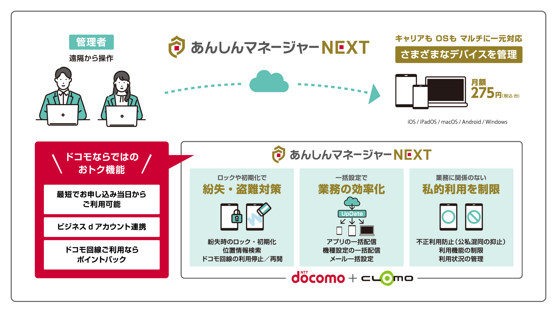 「あんしんマネージャーNEXT」は、国産MDMである株式会社アイキューブドシステムズ「CLOMO MDM」をベースに、より便利でよりお得なサービスをご利用いただけるよう、ドコモ独自の改良を加えたモバイルデバイス管理サービスです。
