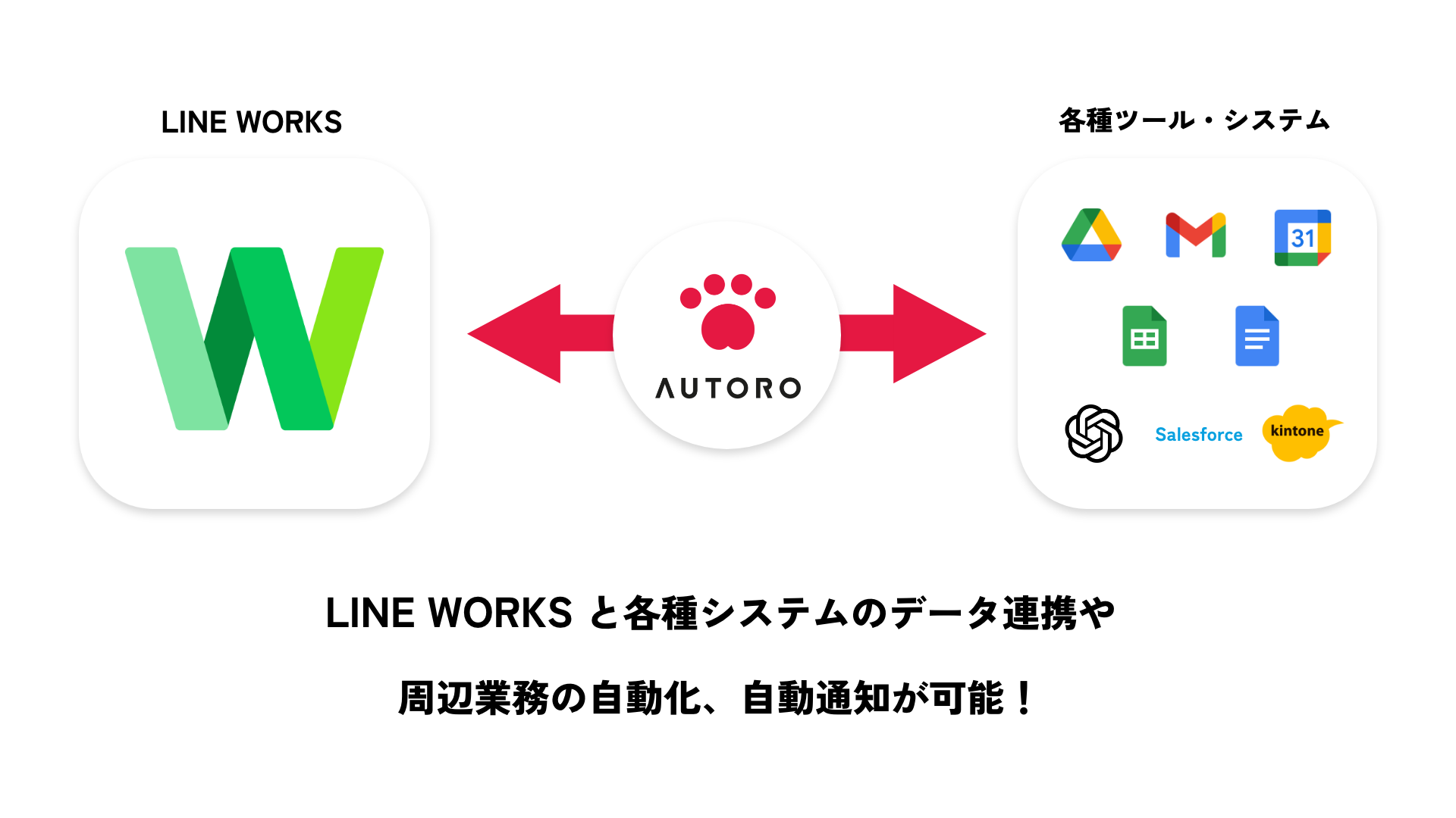 「AUTORO(オートロ)」は、ブラウザの自動化を、素早く、ノーコードで実現する業務自動化ロボットです。多数のAPI連携機能を標準搭載しているため、「LINE WORKS」を始めとした、ご利用中の各種SaaSやクラウドツールと簡単に連携が可能。デスクトップやアプリの操作もスムーズに自動化できます。