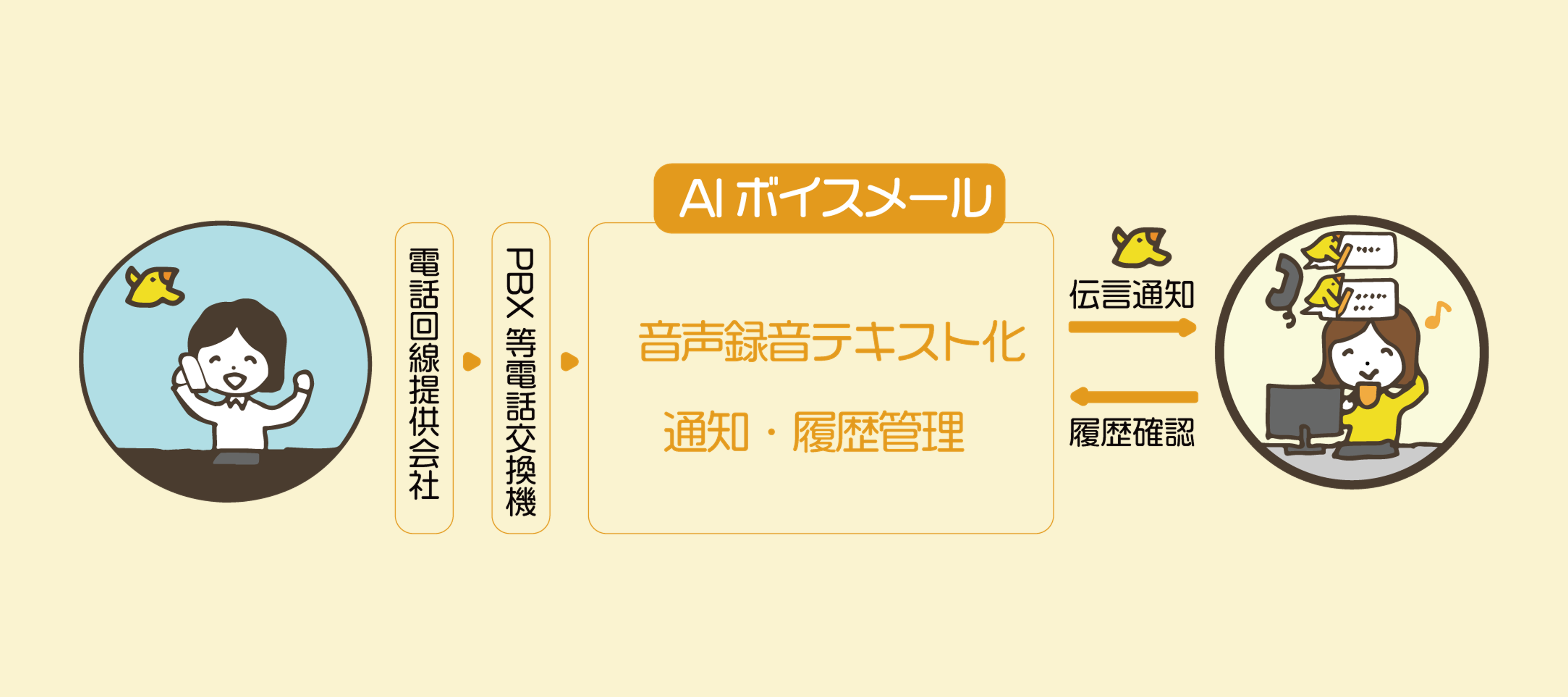 代表電話や携帯電話に入った留守番電話を、「テキスト」でも「音声」でも確認できるサービスです。留守電サービスセンターに問い合わせなくても、LINE WORKSやメールといったコミュニケーションサービスでテキスト化された伝言を確認できます。「いつ」「誰から」「何の」用件があったのかを手軽に確認できるので、柔軟な働き方を支援し、一人当たりの生産性向上を実現します。