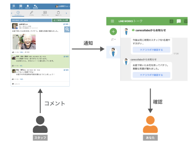 ケアコラボ上で「ご家族へ公開」と指定した記録に、ご家族からコメントがあった場合LINE WORKSのトークにも通知が届きます。