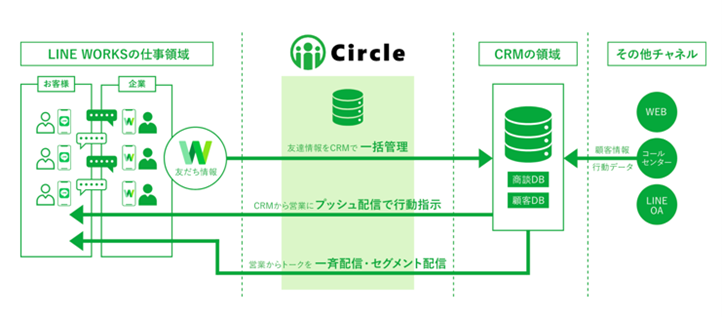 Circleは、LINE WORKS連携による「セールスオートメーション」と、営業CMSによる「LINEを使った活動の可視化」のふたつの機能が売りのセールスイネーブルメントツールです。LINEという圧倒的なエンゲージメントを実現する営業タッチポイントを活⽤し、営業成約率の向上に寄与します。LINEの友だちデータを取得し、このデータに基づき、友だち接点ごとの営業⾏動・顧客⾏動データを検知・収集・改善・セールスプロセスの⾃動化をしたい⽅にオススメです。