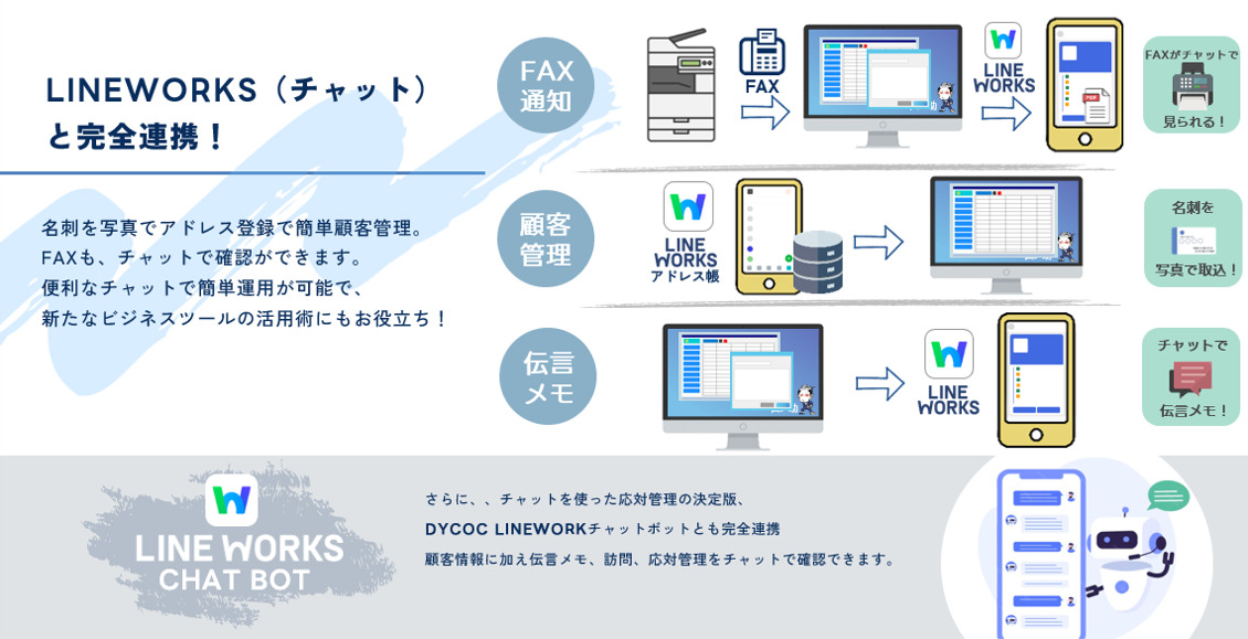 応対管理:LINE WORKSのBotを利用して、簡単に応対を登録。更にLINE WORKS上から応対履歴情報を確認することができます。