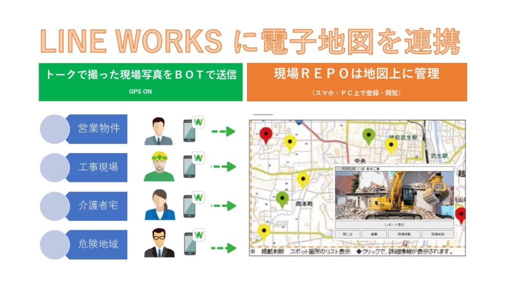 現場REPOは、電子地図上に「現場」を登録し、写真や文字情報を紐づけて管理できます。その場の状況や経過を示す写真や報告等のレポートをLINE WORKSから投稿できます。GPS等の撮影場所を示す情報を含んだ写真は、自動的に地図上に位置づけられます。屋外ではスマートフォンから投稿、事務所ではPCで地図を俯瞰する等、シーンに応じて運用できます。最大で3000件程度の現場を登録可能、作業の進捗報告や地域に点在する設備や拠点の管理等、幅広く利用できます。国土地理院の地図データを利用し、日本国内の測量範囲が対象です。