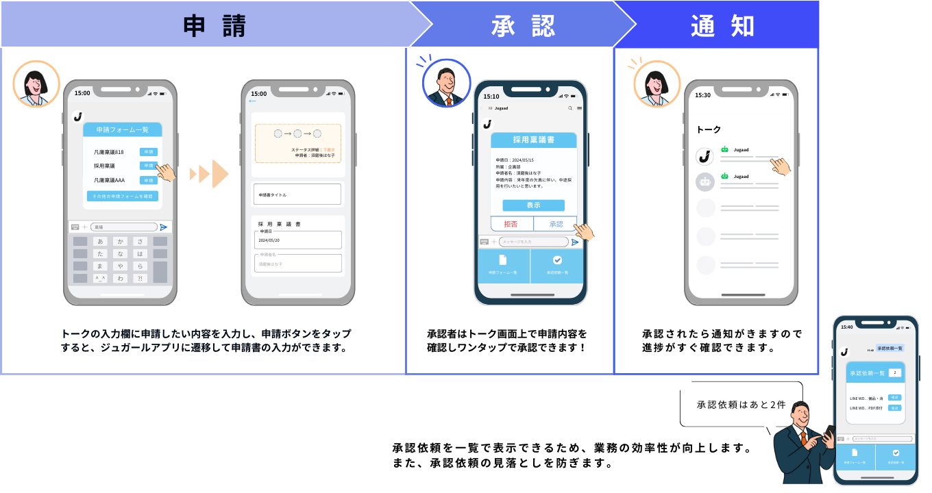 ・LINE WORKSで受け取った通知から、申請内容の確認や承認が可能です。