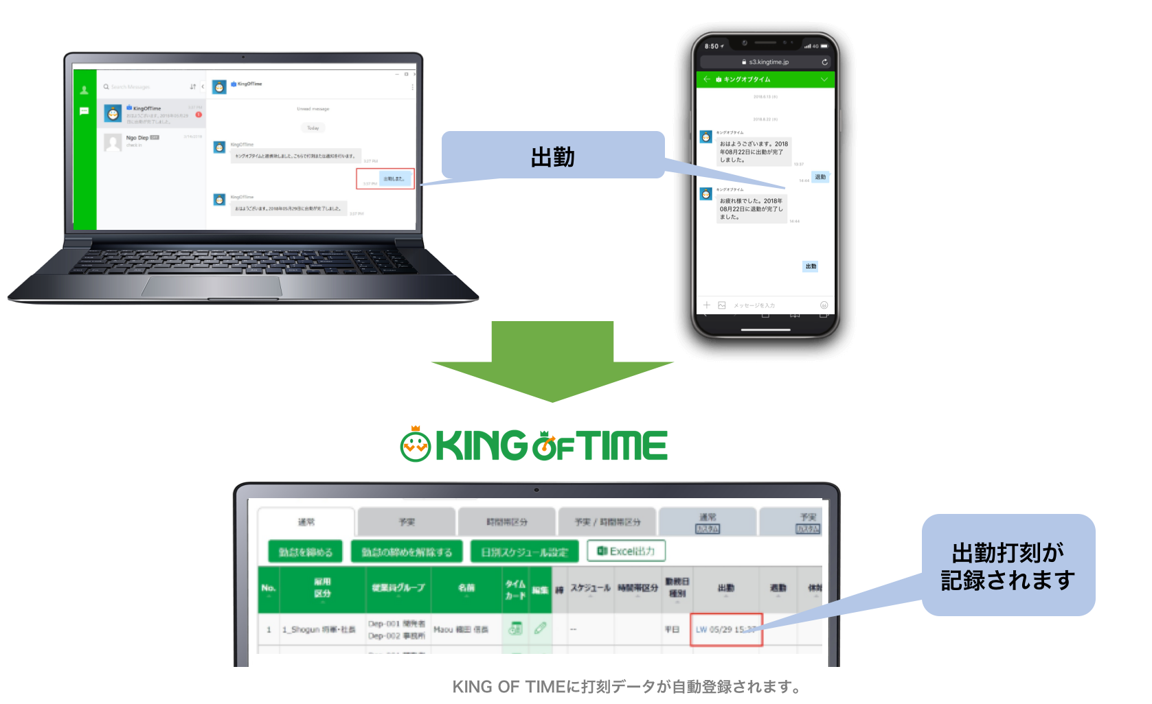 LINE WORKSから「おはよう」「お疲れ様」など指定された文字を送信するだけで、出勤・退勤打刻として扱われ、KING OF TIMEに打刻データが自動登録されます!!