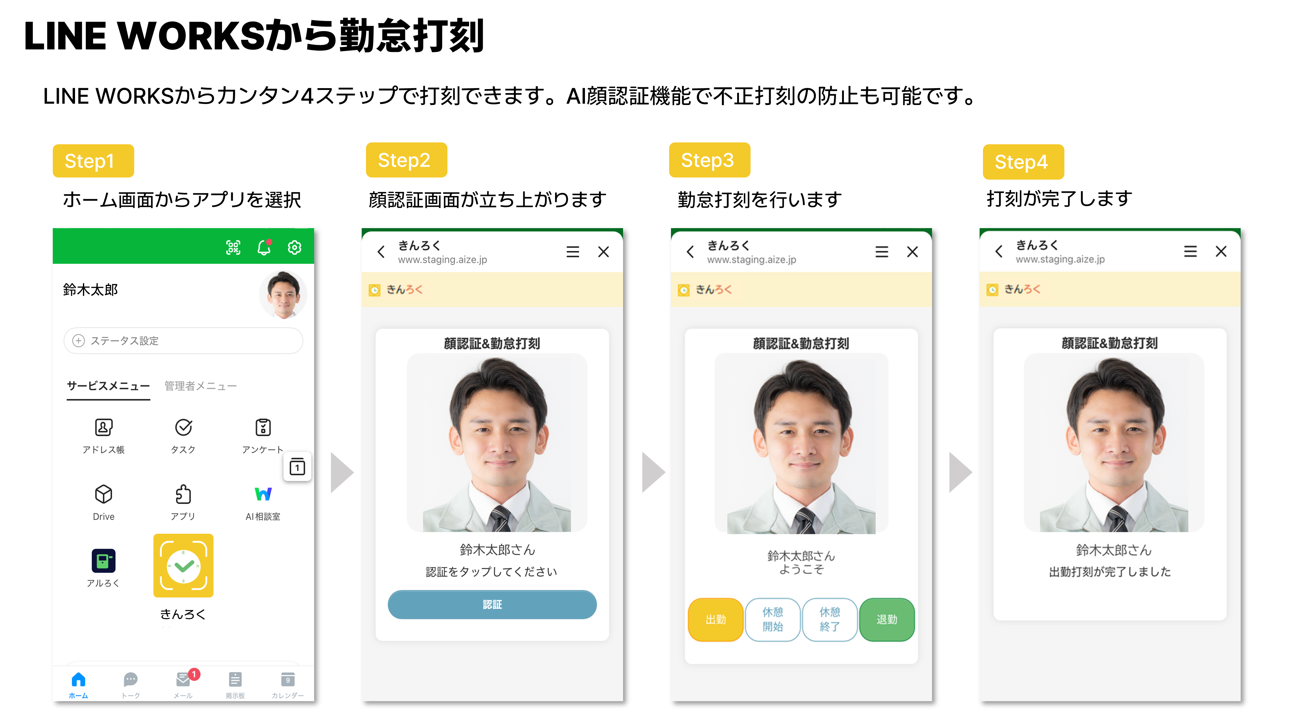LINE WORKSから勤怠の打刻ができるほか、AI顔認証やGPSとの連携によって、適切に勤務状況を管理することができます。