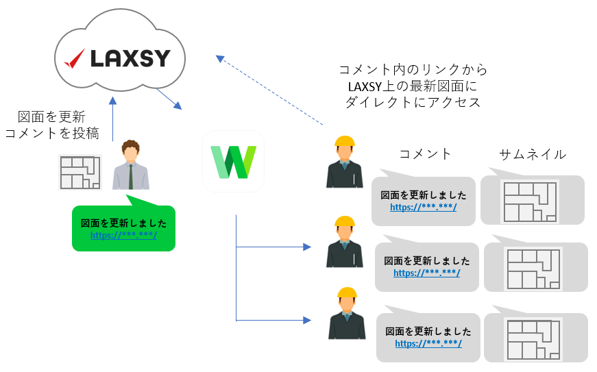 「CheX/LAXSY」上の図面やドキュメントに更新があった場合、任意のタイミングで「LINE WORKS」経由で関係者へお知らせすることができます。