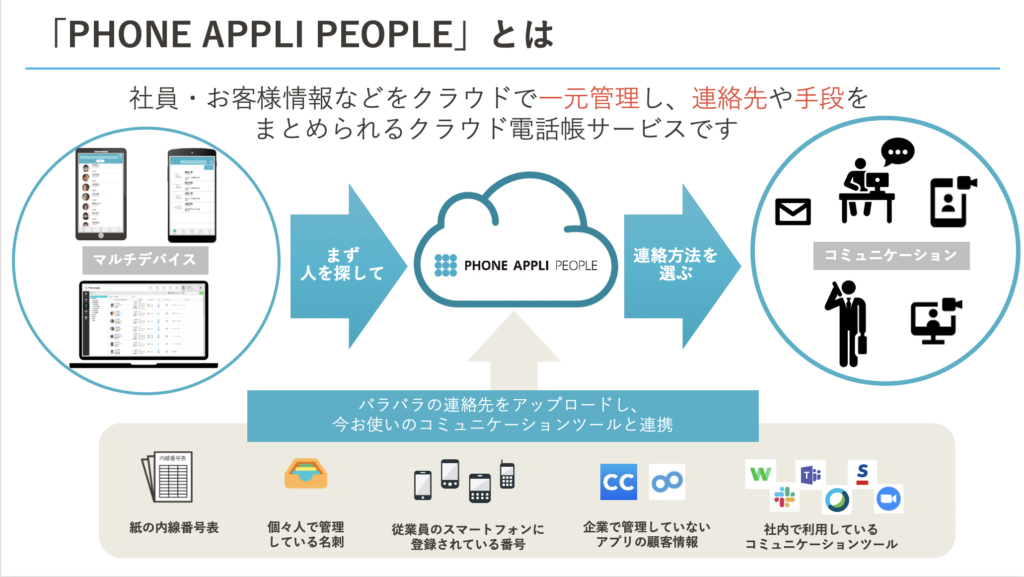 テレワークや、リモートワークの中で、社内のコミュニケーションをとりたい相手を探す際、相手のスキルや資格、担当顧客などをみてから連絡することで、スムーズなコミュニケーションをとることが可能。その際、電話、メール、LINE WORKSなどを選択できることに加え、予定表や社員の居場所などと連携し、相手の状況をみながら、適切なコミュニケーション手段を選ぶことが可能。また、私用スマートデバイスの利用(BYOD)でも、電話帳がクラウドにあるため、個人情報の漏洩のリスクが低減され、セキュアに利用ができます。
