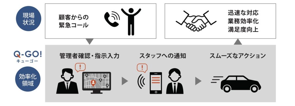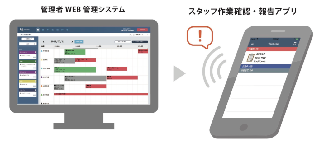 Q-GOは外勤スタッフの作業管理に特化したサービスです。遠隔で作業を実施するスタッフが、スマートフォンで作業内容の確認や報告が出来ると共に、作業を指示する管理者が、作業状況をWEB画面で把握することが出来ます。管理者とスタッフの電話でのやり取り、紙の利用に伴う移動時間を抑えることで、作業効率の向上をサポートします。
