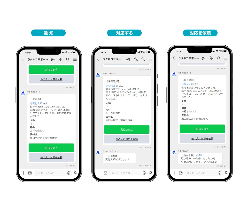 例えば、面接ボタンは人事のトークルームへ通知、集荷配送業者ボタンは総務のトークルームへ通知など柔軟な対応が可能です。
