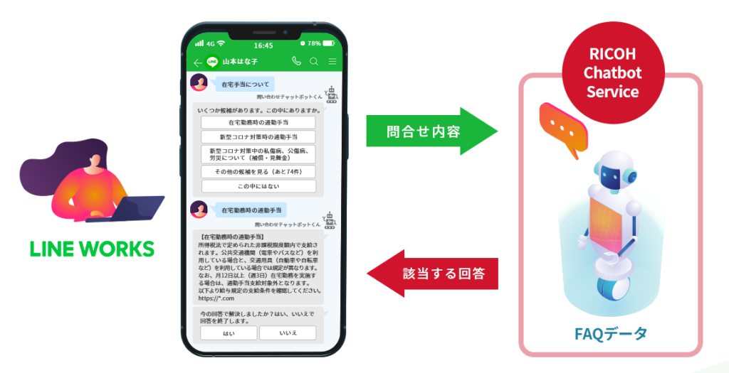 RICOH Chatbot Serviceは、社内やお客様からの問い合わせに自動で回答し、問合せ業務を削減します。ユーザーは使い慣れたLINE WORKS上からいつでも問い合わせができ必要な情報にスピーディーにアクセスできるので満足度があがります。一方、問合せ対応者は負担が軽減され本来の業務に集中できるようになり生産性向上につなげられます。