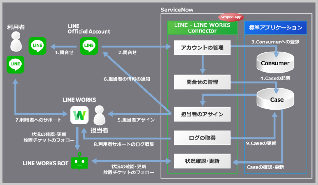 問合せ者様がLINEより公式アカウント経由にて投稿した内容をServiceNowに蓄積し、蓄積された情報に対してLINE WORKSより下記の機能をご利用頂くことが可能です。
