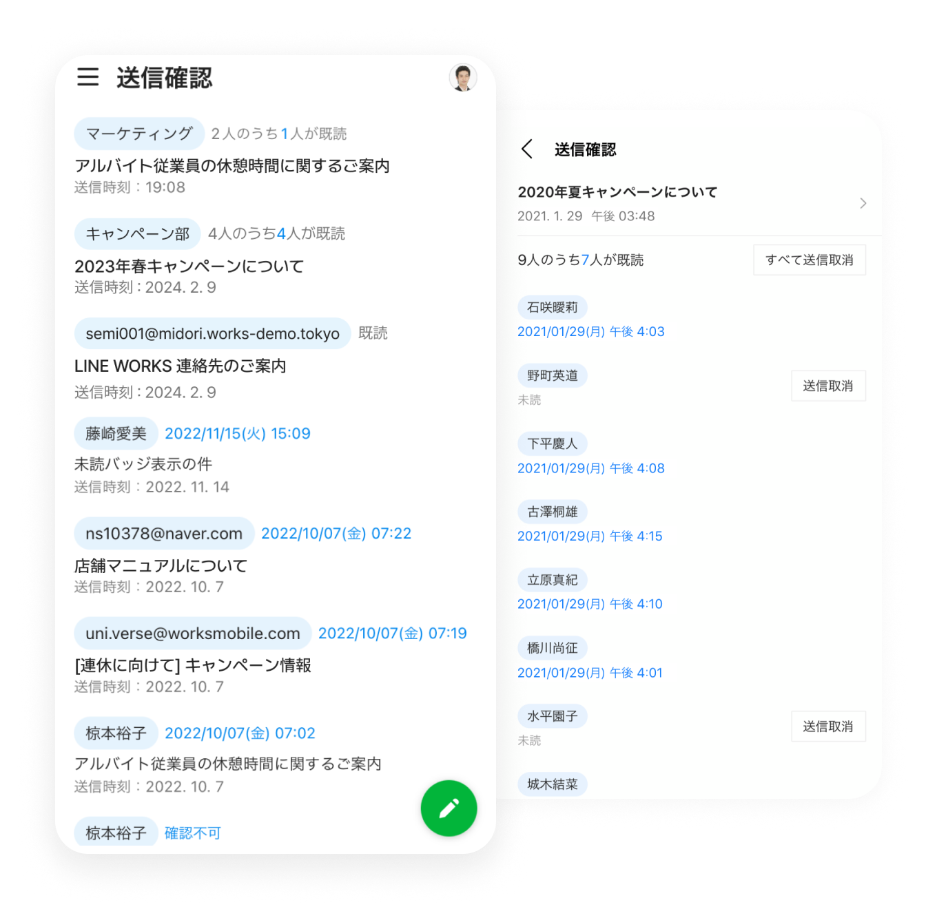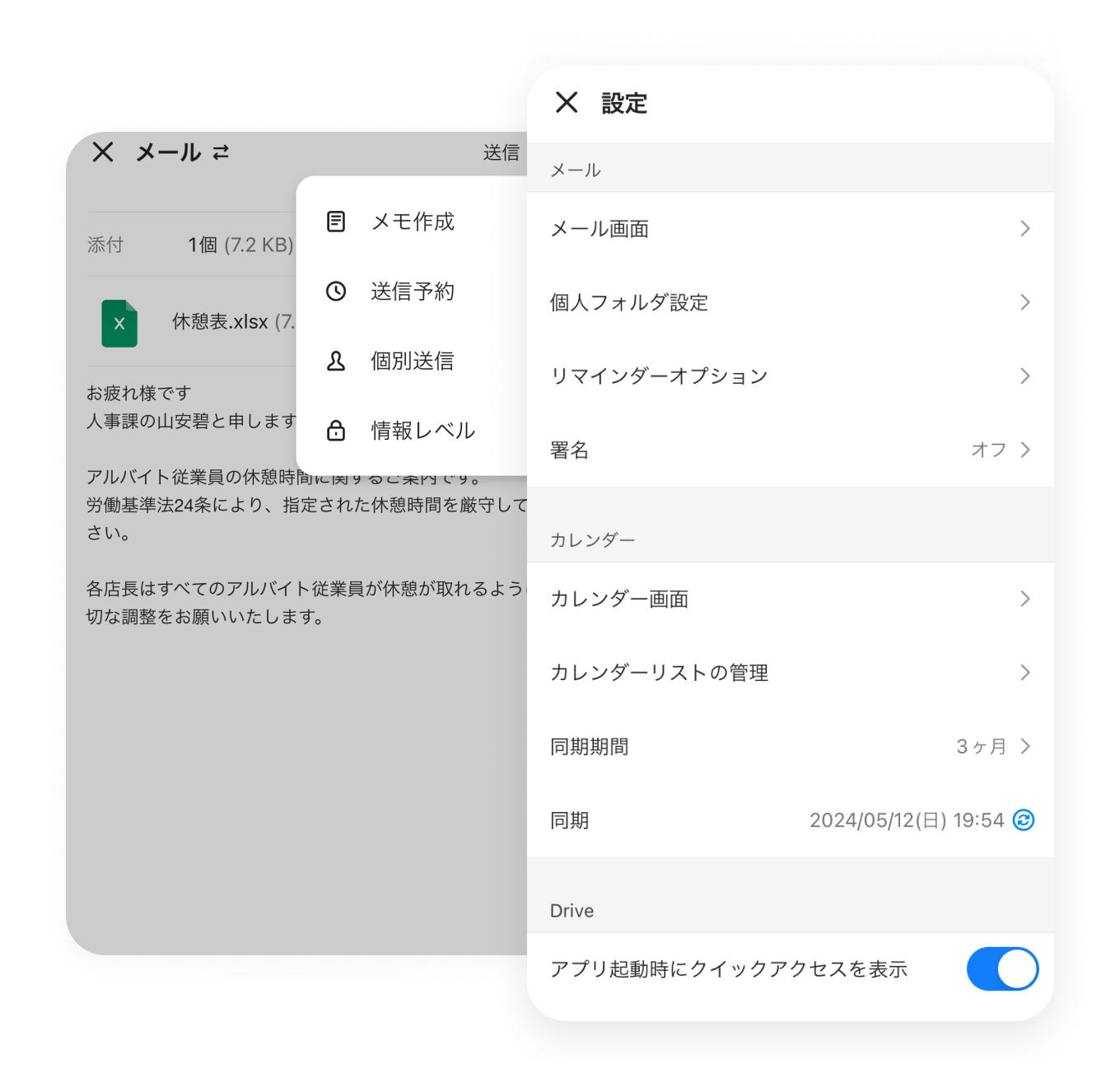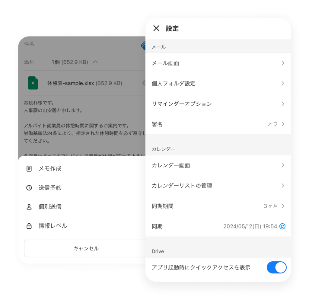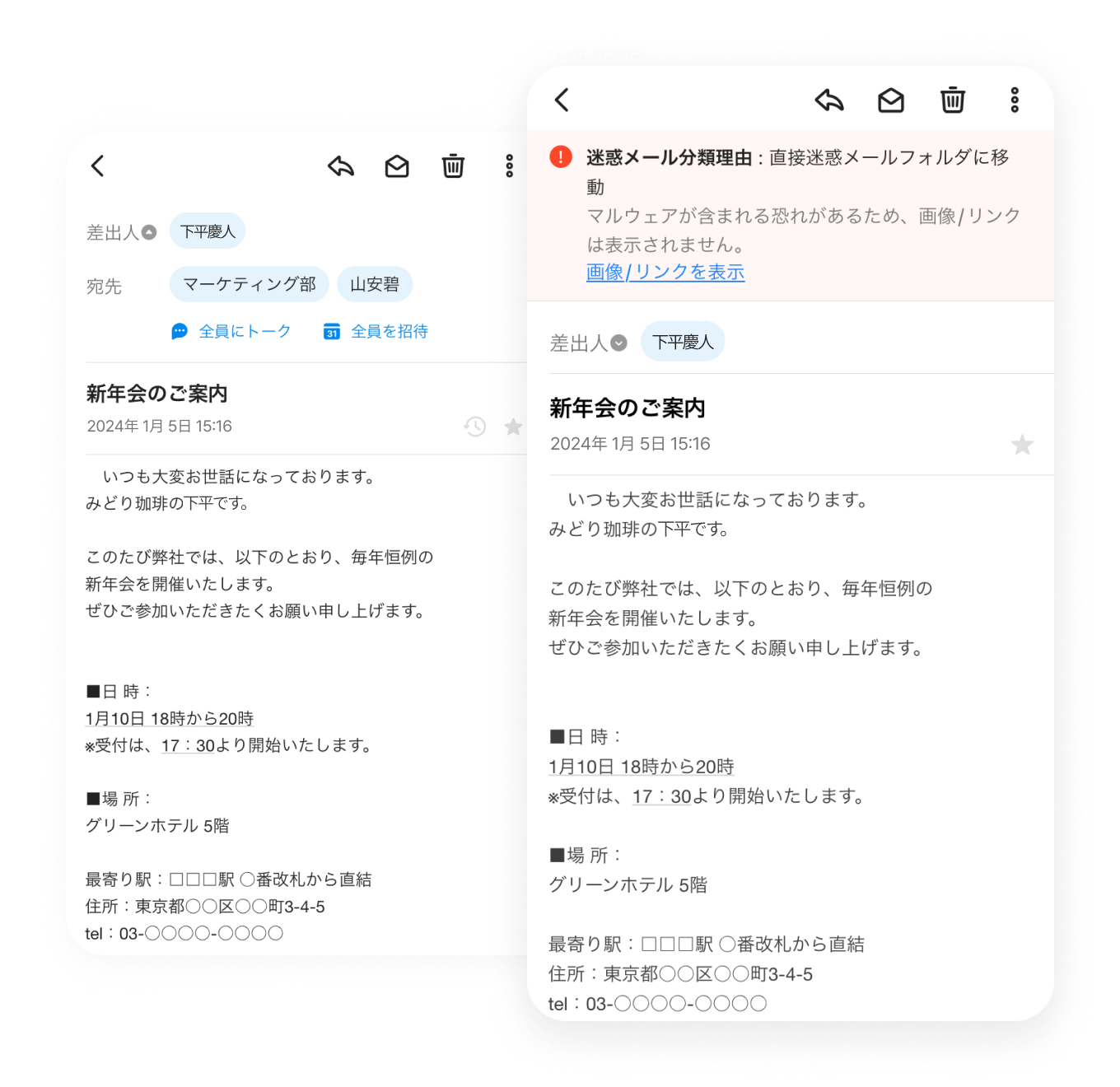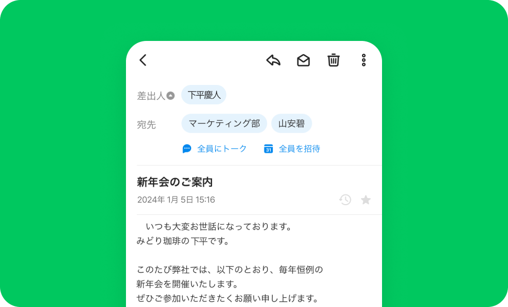メール メール なりすまし対策も備えた万全のセキュリティ アドバンスト トーク 掲示板 カレンダー タスク アンケート アドレス帳 メール Drive 管理 Bot Menu トーク 掲示板 カレンダー タスク アンケート アドレス帳 メール Drive 管理 Bot Business email あなたのビジネスに必要な メールアドレスで利用できます 新規に取得したドメインはもちろん、現在使用中のメールアドレスもLINE WORKSでそのまま使用できます。これからビジネスを始める人も、既存の顧客や取引先がある人も、必要なメールアドレスで利用できます。 LINE WORKSを一緒に使いたいメンバーを招待する Anti-Spam 安心のセキュリティとマルウェア対策 迷惑メール、スパムメール等のほか、受信者の同意なく送られる広告メールも常時対策されています。通信経路の暗号化、ウィルス・マルウェア対策やDKIM対応などにより、脅威を未然に防ぎます。 グループの作り方 グループの作り方 Work-efficient features ビジネスならではの 便利な機能 受信メールの内容に応じた自動分類や、リマインダー機能など確認漏れを防ぎ効率的なメール管理が行なえる機能を備えています。社内メンバーへの送信メールでは開封確認や送信取消も利用可能です。 建設業現場でLINE WORKS活用方法 Mobile Use モバイル利用にも強い 翻訳、下書き保存、送信予約やリマインダーなど、モバイルからもブラウザでの利用とほぼ変わらない機能が使えます。ブラウザ版ではテンプレートや署名など、より便利な機能も設定可能です。 グループの作り方 グループの作り方 その他の機能について その他の機能についてはサービス機能一覧をご参照ください。 携帯からですと個人のメールアドレスから返信することになってしまいます。得意先などへ返信する場合は印象がよくないため、帰社してから対応しなければなりませんでした。一般SNSを使って業務連絡をし合う社員も見られ、メールの利用環境を整備するとともに、秘匿すべき業務情報がSNSから漏えいしないよう、セキュリティ対策を講じる必要に迫られました。 インタビューをもっと見る 社長室 広報課 田中 可南子さん 関連情報 # 導入事例 公益財団法人 日本ラグビーフットボール協会 メールには数十秒の保留送信を設定しているので、[送信]クリック後でも設定時間内なら送信を取り消せます。これにより誤送信のリスクが軽減され、トークのログ管理もできるため、セキュアな環境が構築されたと思っています # 導入事例 株式会社キャリアコンサルティング 課題となっていたのは、社外でのメール対応です。会社のアドレス宛てのメールは携帯に転送することで閲覧はできましたが、得意先などへ返信する場合は印象がよくないため、帰社してから対応しなければなりませんでした。 # 導入事例 栃木トヨタ自動車株式会社 全社員が利用できる環境になかった社内ポータルをLINE WORKSのホームに移行し、内部用のメールシステムと外部向けのメールシステムも、LINE WORKSのメールに統一することができました。 今すぐ無料ではじめよう!
