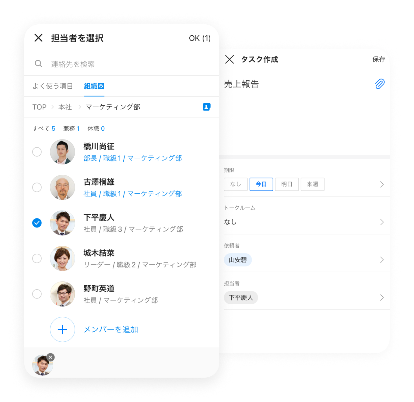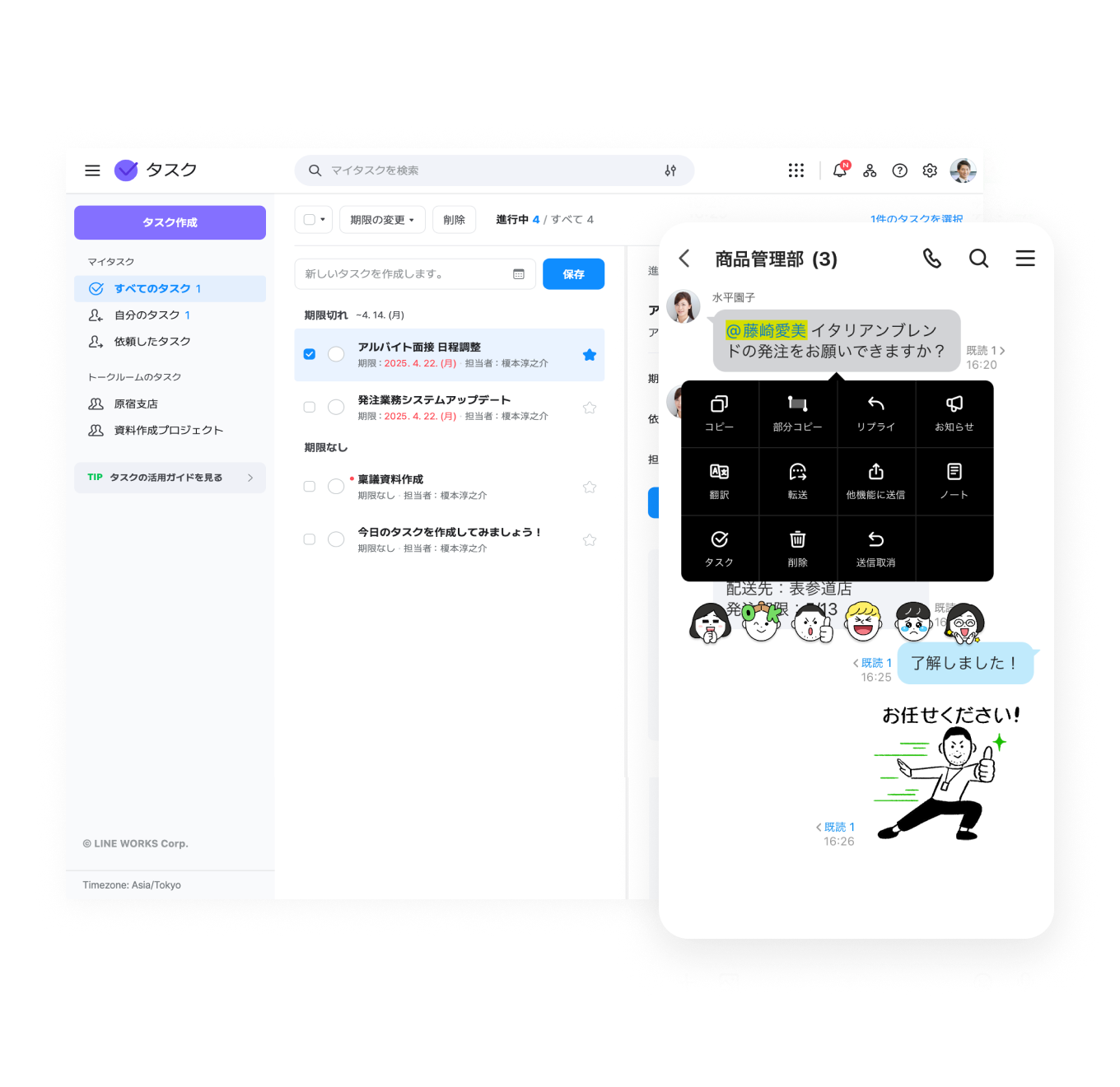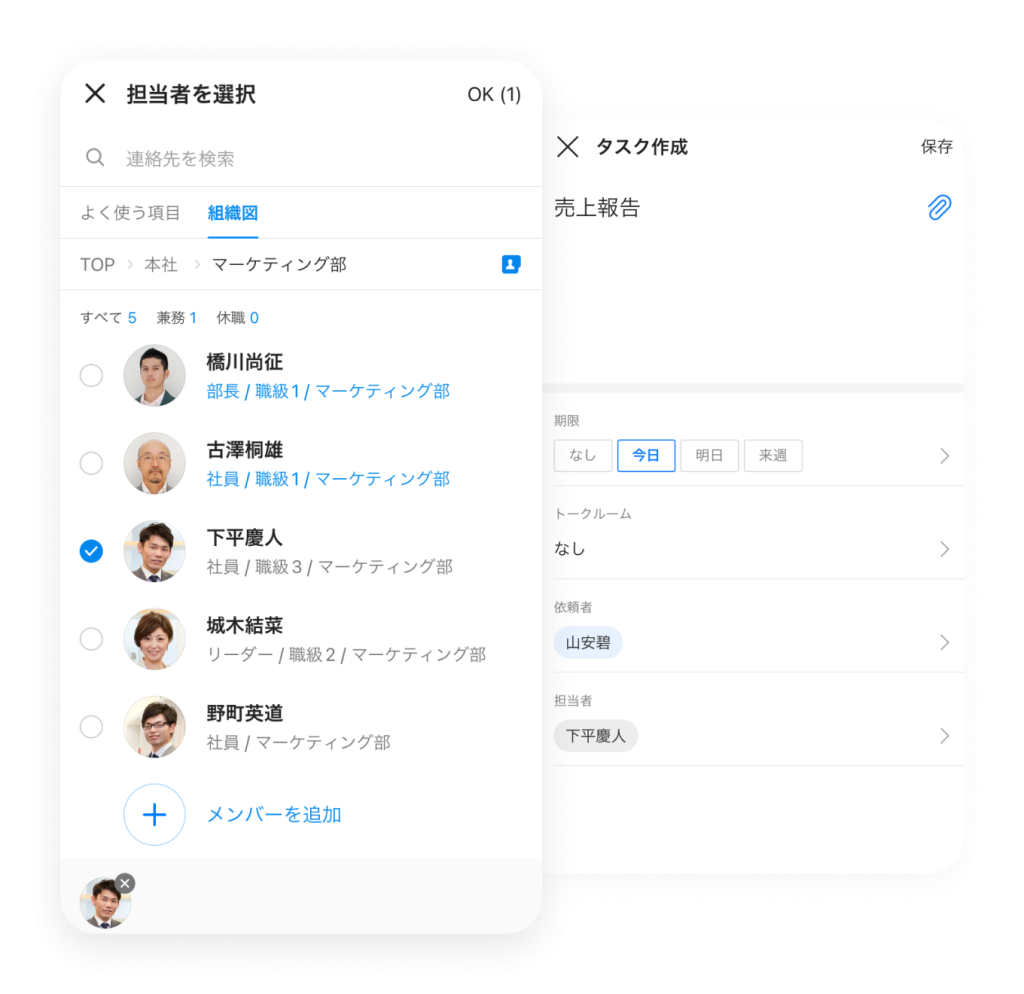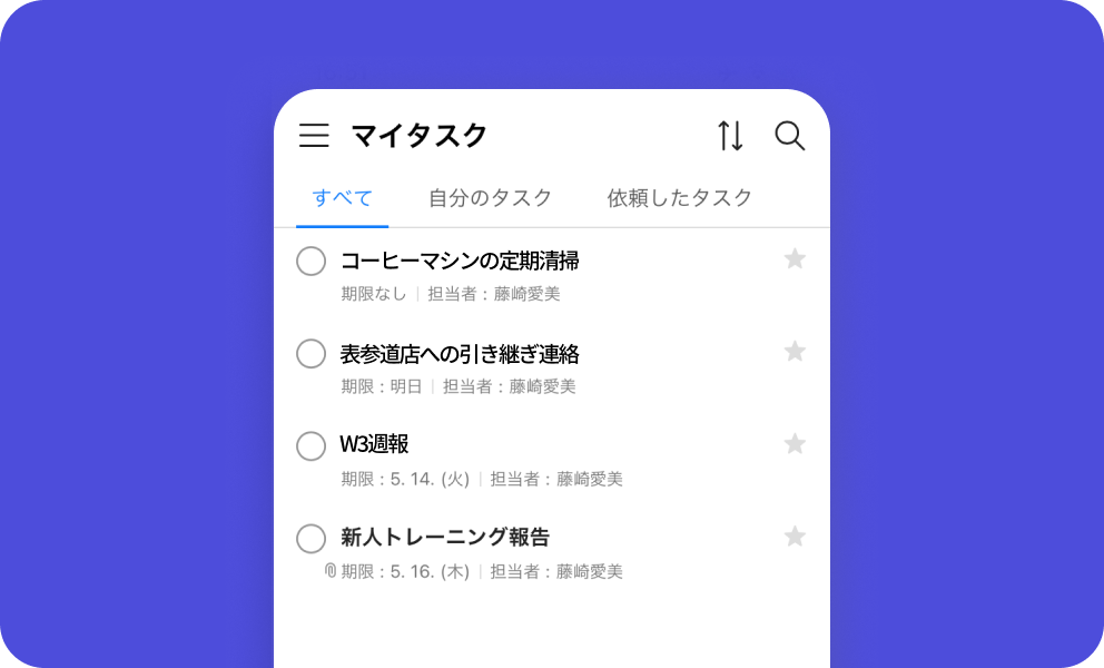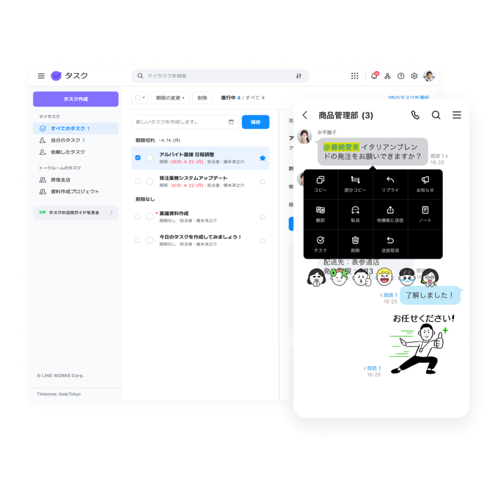 タスク タスク 自分のタスク管理も、メンバーへの依頼も フリー スタンダード アドバンスト トーク 掲示板 カレンダー タスク アンケート アドレス帳 メール Drive 管理 Bot Menu トーク 掲示板 カレンダー タスク アンケート アドレス帳 メール Drive 管理 Bot My To-Do List 毎日の「やるべきこと」を管理 発注や清掃業務など現場で発生する作業から、顧客や取引先への連絡、報告書や資料の作成まで、「やるべきこと」を登録し管理できます。トーク内容からも簡単にタスクを作成可能です。 会社内のスケジュール管理、可視化する方法 Task Assignment メンバーへの依頼も簡単 他のメンバーへの作業依頼も「担当者」を選択するだけで簡単に行なえます。依頼したタスクの一覧や、担当者の変更履歴なども確認でき、資料などファイルの添付も可能です。 グループの作り方 グループの作り方 Mobile Use モバイルだけでも管理できる 移動中や外出先からでもスマートフォンでタスクの管理ができます。今日の作業確認や、修正、完了などの操作はもちろん、メンバーへの新たな依頼も、PCを開くことなくモバイルだけで完結できます。 会議室や施設、設備利用予定の管理方法 その他の機能について その他の機能についてはサービス機能一覧をご参照ください。 LINE WORKS導入前、社員のスケジュールは、事務所にある紙の一週間のスケジュール表に簡単に記入する方式で行っていました。LINE WORKSを導入してデジタル化したことで、「書く」という手間や紙代のコストを削減できましたし、各担当者の詳細な居場所などもわかるので、すぐに連絡ができるようになりました。 インタビューをもっと見る 有限会社紀洲風呂 小原社長 関連情報 #機能紹介 メジャーアップデート特集! 2021年2月にリリースされるアップデートで、LINE WORKSはアプリのバージョンが 3.0 を迎えることになりました。本アップデートでは、 # 活用事例 設計から建設まで生産性を向上する方法 予定された工期内に確実に工事を完了させたい場合は、LINE WORKS カレンダーでスケジュール管理してみましょう。 タスクや作業ごとに細かい工事計画を立てるこ # 連携ソリューション ReTask(リタスク) ReTask(リタスク)は、各部門間やプロジェクトメンバーの業務を見える化し、リーダーの管理業務の軽減を目的としたクラウド型タスク管理ツールです。 今すぐ無料ではじめよう!