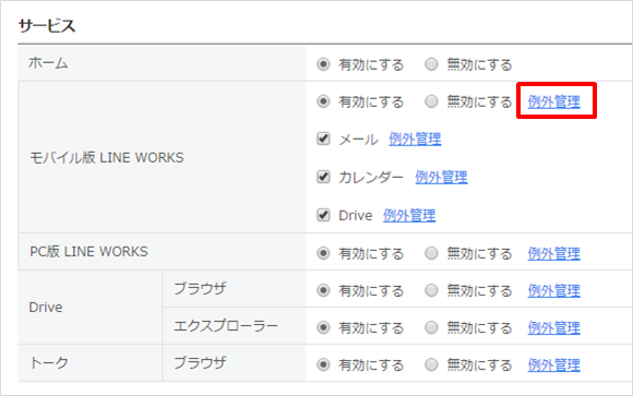 会社全体ではモバイルアプリを使用するが、アルバイトのような非正規メンバーにはモバイルアプリを使用させないといった場合は、例外管理機能を使うことで設定できます。