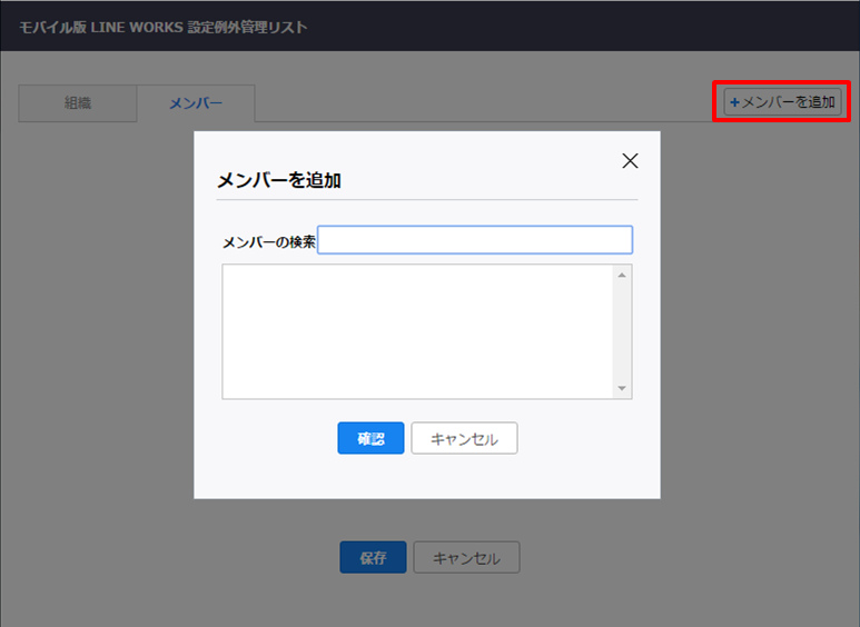 クリックして表示される例外管理リスト画面でメンバーを追加し設定内容を保存します。