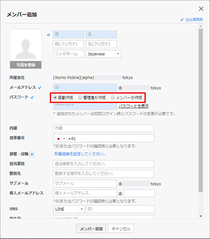 「パスワード自動作成」または「管理者が作成」を選択してメンバーを追加した場合