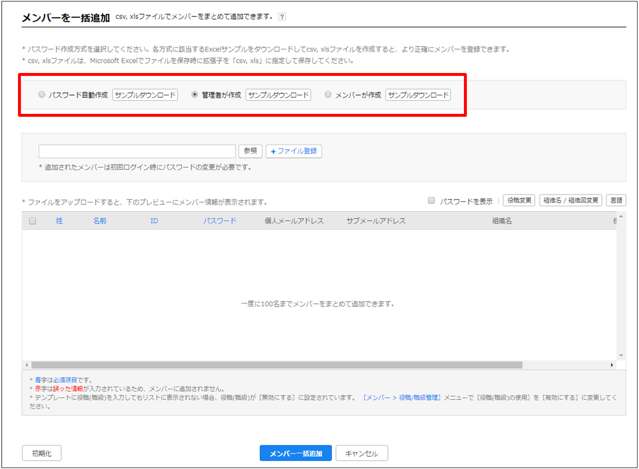 [メンバーを一括追加]をクリックして表示される「メンバーを一括追加」画面より、メンバー一括追加用のサンプルファイルをダウンロードします。メンバーの追加は、パスワードの作成方式により下記3つのオプションがあります。