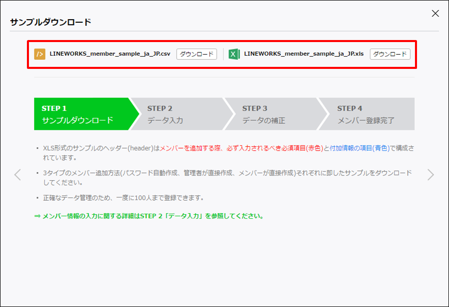1. メンバーを一括追加するためのサンプルファイルをダウンロードする