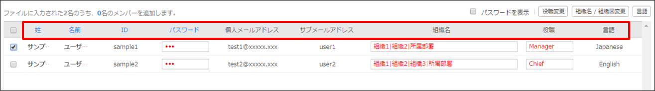 サンプルファイルの項目に合わせて追加するメンバーの情報を記入してください。入力必須項目は、選択したパスワードの作成方式オプションごとに異なります。各方式の必須入力項目は下記となります。