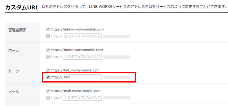 LINE WORKSの管理者画面で、サービス単位で使用するURLを入力してください。