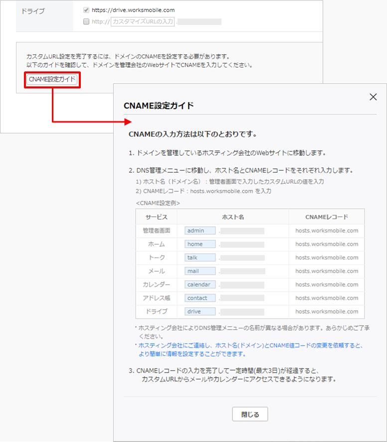 例)talk.custom.com - CNAMEレコード:「hosts.worksmobile.com」を入力