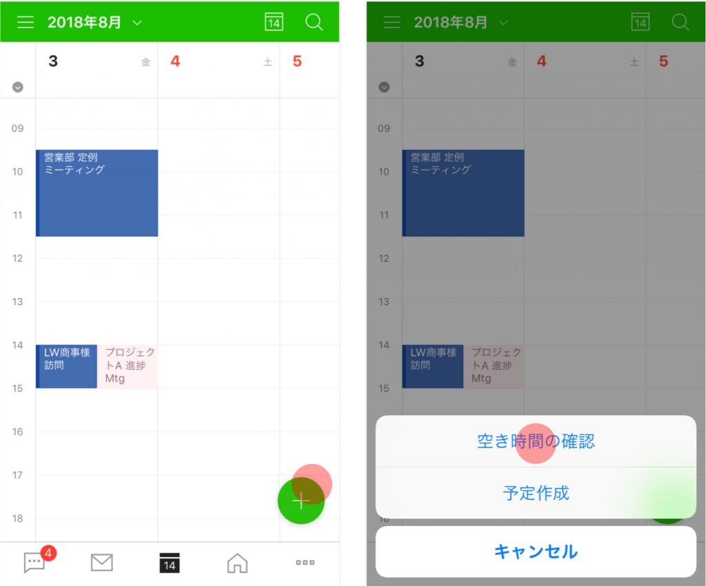 モバイル版アプリのカレンダーで[+]をタップして「空き時間の確認」を選択します。