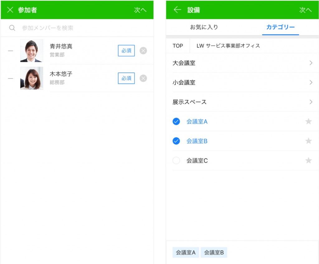 次に会議室やプロジェクターなどの共有設備を選択します。候補の設備をまとめて選択しておくと、まとめて空き時間を確認できるので便利です。