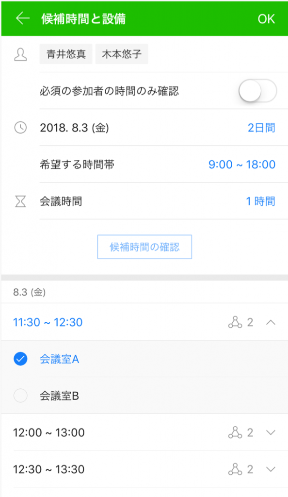 メンバーと設備を選択したら、空き時間が一覧で表示されます。期間や時間帯、予定の長さを選択して、[候補時間の確認]をタップすると、設定した条件で再検索できます。