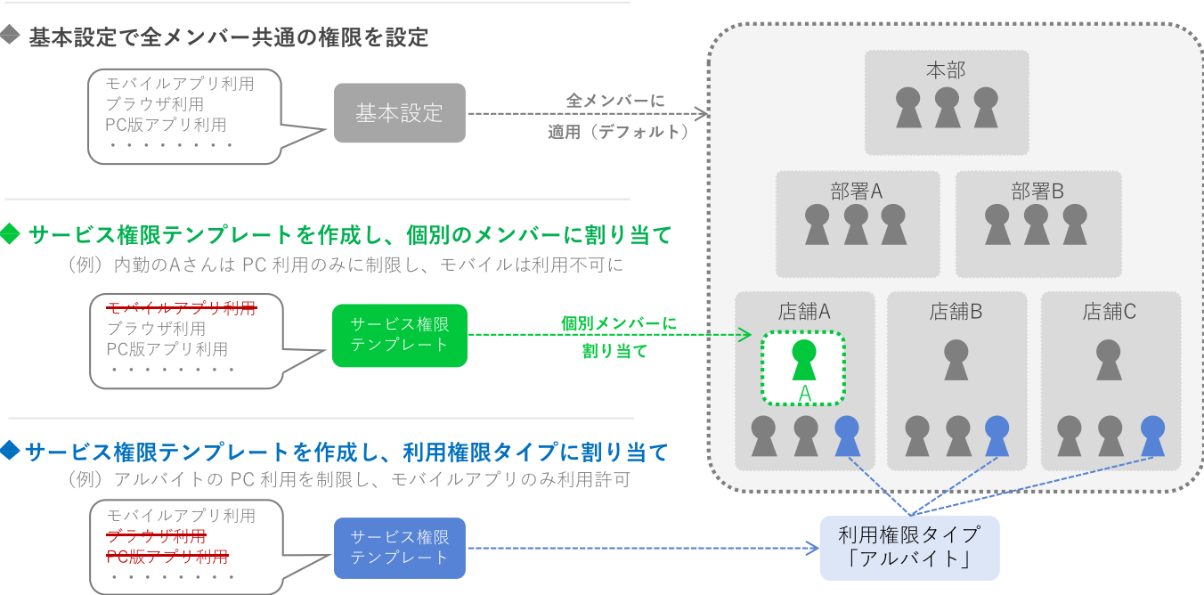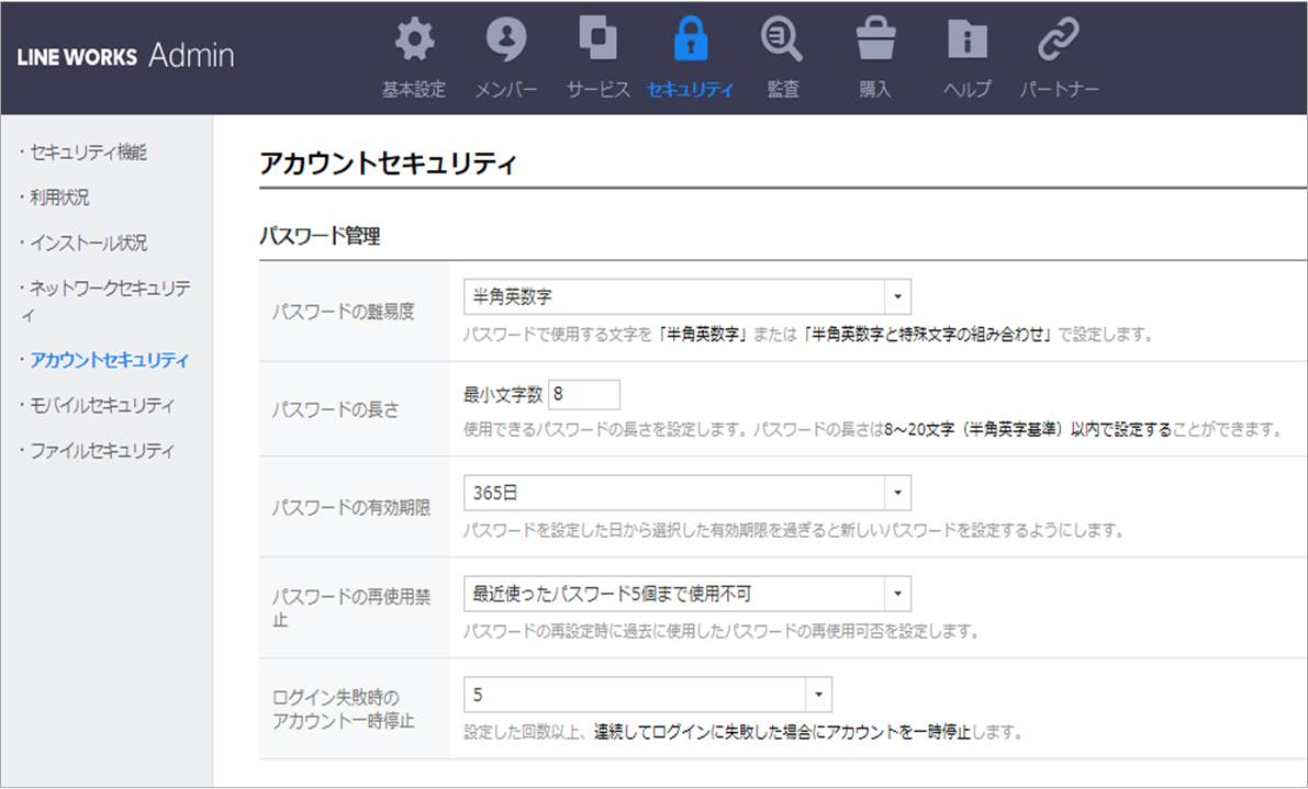 Guide LINE WORKS関連の様々なタイプの問い合わせをこちらで行うことができます。 ブログ 管理 メール トーク Drive アンケート カレンダー もっと見る アドレス帳 グループ はじめて ホーム Menu ブログ 管理 メール トーク Drive アンケート カレンダー もっと見る アドレス帳 グループ はじめて ホーム admin 管理 管理 元サイボウズLiveユーザーのためのLINE WORKS利用ガイド サイボウズLiveの終了に伴い、代わりのツールとしてLINE WORKSをご検討頂くケースが増えております。 「サイボウズLiveとLINE WORKSってどう 2019.03.26 管理 外部トーク連携の利用設定 メンバーがLINEユーザーや外部のLINE WORKSユーザーとやりとりするためには、管理者が管理者画面で外部トーク連携を有効にした後、外部トーク連携を利用でき 2018.09.11 管理 組織の追加・修正 メンバーが増えてきたら、新しい組織を追加して整理しましょう。 モバイル版アプリから組織追加画面にアクセス モバイル版アプリの管理者画面で [組織] 2018.08.24 管理 メンバーの追加・修正 LINE WORKSをより多くのメンバーと使用したいときは、管理者画面からメンバーを追加しましょう。モバイル版アプリもしくはブラウザで追加できます。   2018.08.24 管理 サービス利用設定:テンプレートを作成してメンバーごとに利用制限 ひとつの組織の中には多様なメンバーがいます。雇用形態や業務、職種はバラバラで、それぞれに合わせた制度や環境を整えることは容易なことではありません。 2018.02.08 管理 公式アカウント「LINE WORKS チーム」の受信設定 LINE WORKS チーム とは 「LINE WORKS チーム」とは、LINE WORKSを提供するワークスモバイルが運営する公式アカウントです。新しい機能 2017.11.28 管理 特定のファイル形式の共有を制限 ファイル形式を指定して添付・送信を制限 LINE WORKSでは、トークでの送信やノートやホームへの投稿に添付するといった様々な方法で、メンバーと 2017.11.27 管理 パスワードポリシーの設定 LINE WORKSではサービスを安心して利用するために、メンバーに安全性の高いログインパスワードを設定させたり、管理者がメンバーのログインパスワードを強制的に 2017.11.24 管理 管理者権限の設定 LINE WORKSでは、管理者権限のテンプレートを作成することで管理者の役割によってアクセスする管理者画面のメニューを設定できます。 デフォルト 2017.11.21 もっと見る 9 23