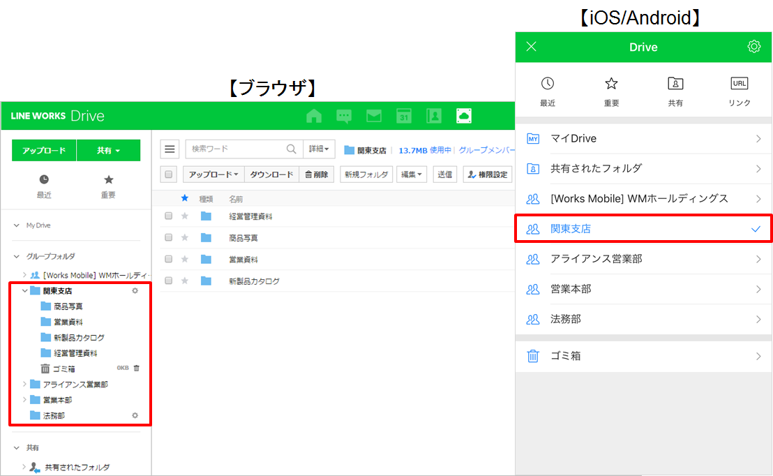 全社フォルダとグループフォルダは、LINE WORKSアプリを使ってスマホからも利用できます。
