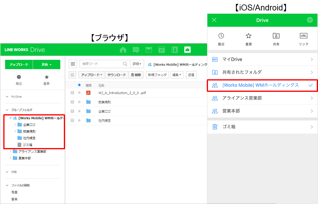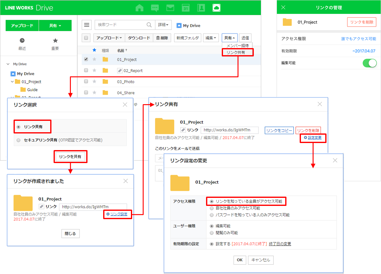 リンクはログインなしでアクセスできるよう設定可能なため、LINE WORKSで繋がっていない外部の人ともリンクによる資料の共有が可能です。またファイルだけでなくフォルダもリンク共有できるため、プロジェクト関連資料を1つのフォルダで管理できます。