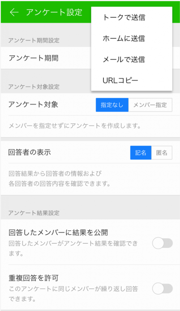 作成したアンケートは、トークやメールで送信したりホームに投稿することでメンバーに共有できます。