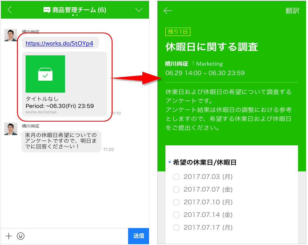 LINE WORKSのアンケート機能で提供しているテンプレート「会食日程/メニューアンケート」を使えば、チームメンバーの意見を一度に取りまとめ、簡単に会食の日程やメニューを決めることができます。また、苦手な料理がないか、選択肢にないおすすめ料理やお店はないか、参加できない理由は何か、その他関連する質問など、あらゆる情報をアンケートを使ってまとめてチェックできます。
