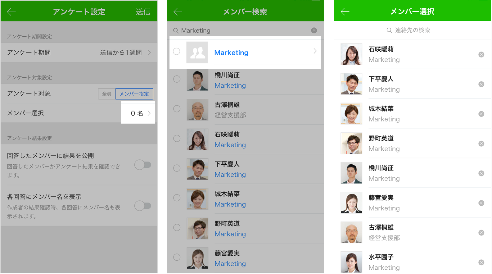 アンケート設定画面で設定対象を[メンバー指定]に変更し、会食に招待したいメンバーや組織を検索して、アンケート対象に追加します。