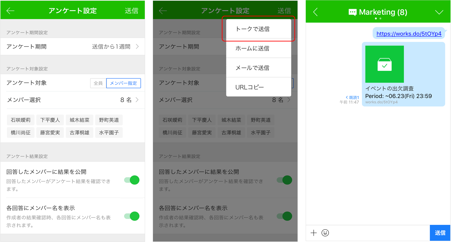 設定が終わったら、画面右上の[送信]をタップし[トークで送信]を選択することで、トークを使って招待したいメンバーにアンケートの回答を依頼することができます。