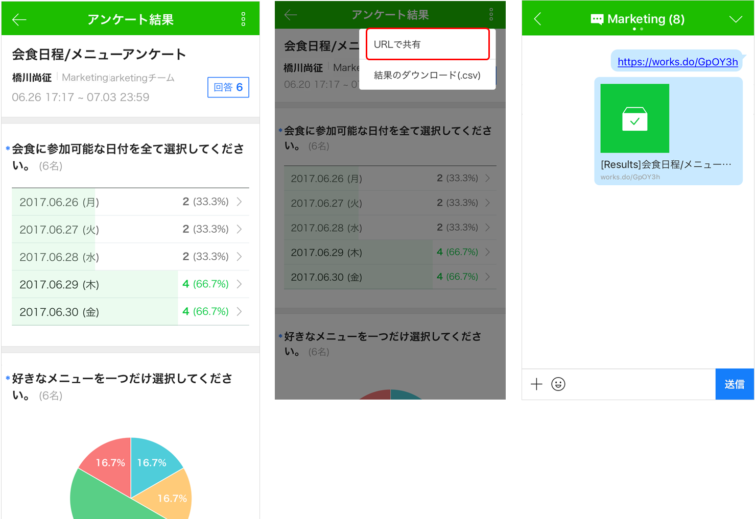 アンケート結果画面右上の[⋮]をタップし、[URLで共有]を選択すると、アンケート結果画面のURLがクリップボードにコピーされます。そのURLを使ってメンバーにアンケート結果を共有することができます。
