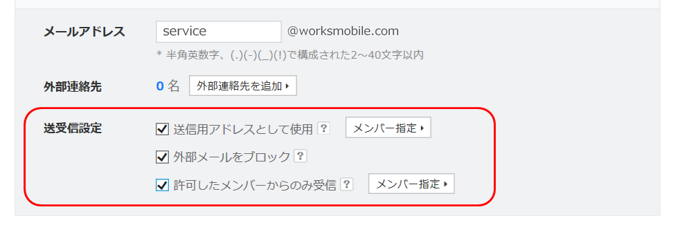 - 送信用アドレスとして使用:指定したメンバーがグループのメーリングリストを送信用アドレスとして使用できます。