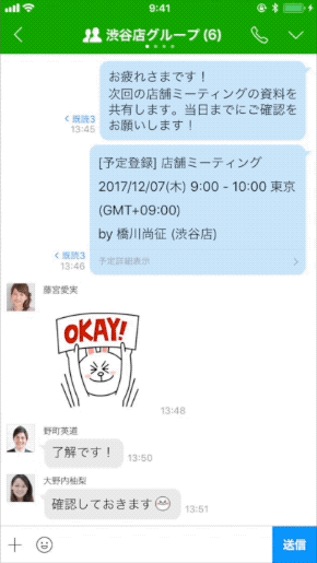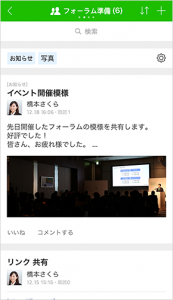ノートを使ってグループのメンバーと共有したい情報を掲示板形式で投稿することができます。ノートの投稿は、あとからグループに追加されたメンバーも参照できます。投稿に対してコメントをつけたり、ファイルやスタンプを添付することも可能です。