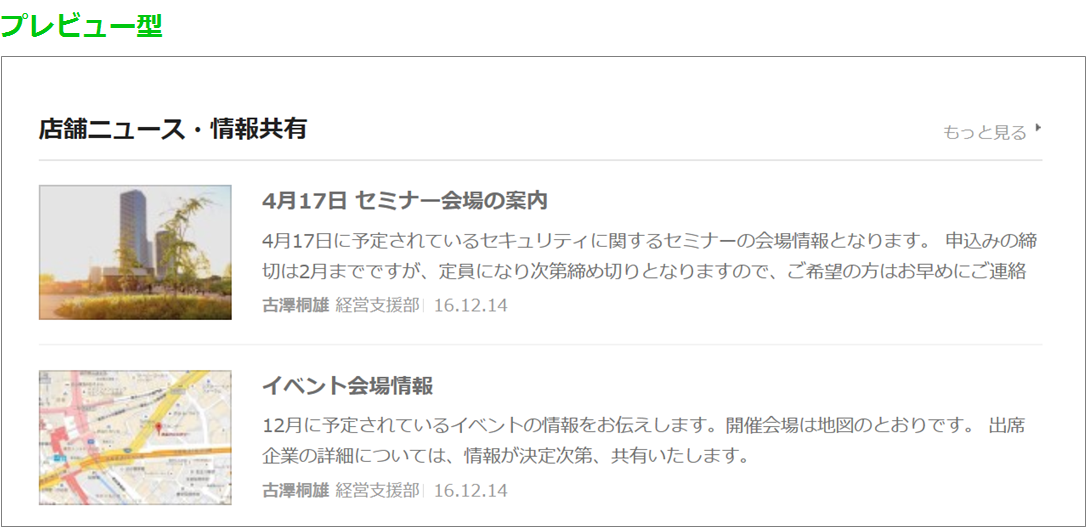 例えば、業務日報などの定常的なお知らせであれば、タイトルを見れば内容を推測できるため、リスト形式で投稿のタイトルを表示できれば十分でしょう。 一方、タイトルだけで内容の推測が難しい投稿は、本文の一部や添付画像が見えると内容の把握が容易になります。