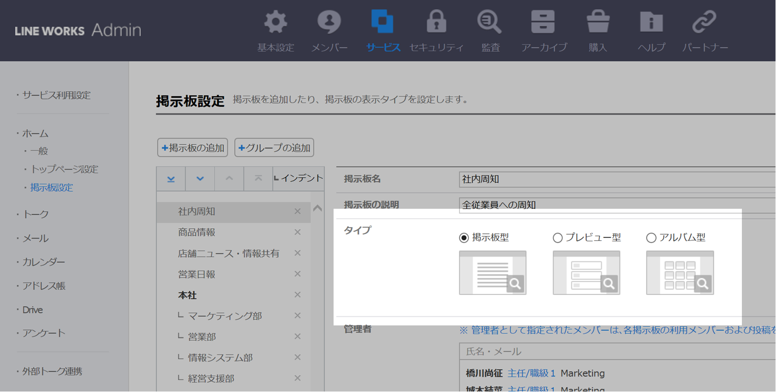 掲示板表示タイプは、管理者画面の[サービス]>[ホーム]>[掲示板設定]で掲示板ごとに設定します。
