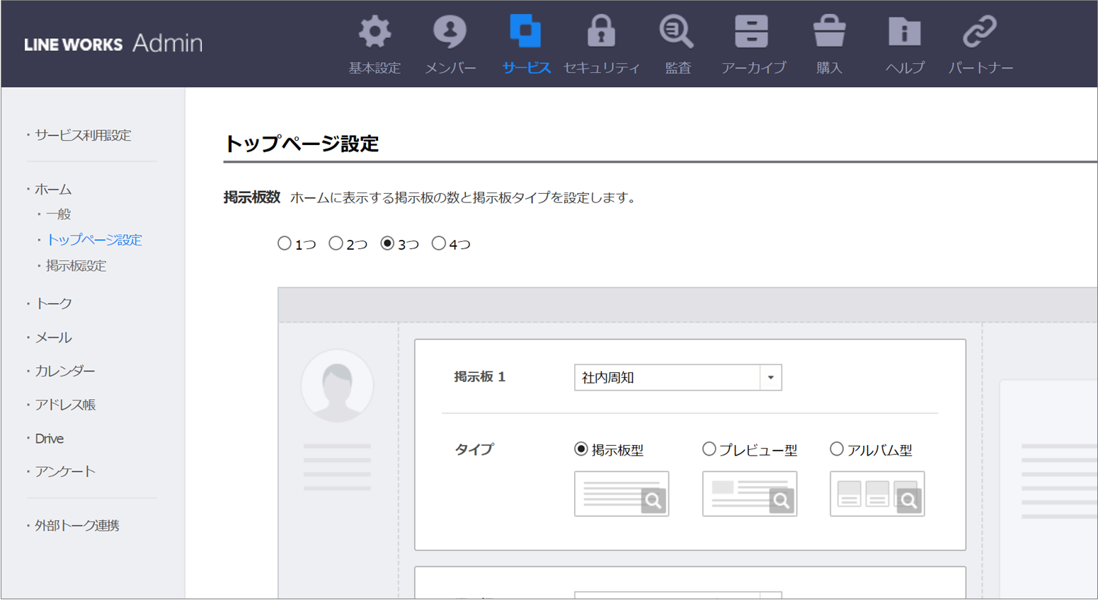 また[サービス]>[ホーム]>[トップページ設定]では、ホームを開いた際のトップページで表示する掲示板とその表示方法を設定できます。トップページには最大4つまで掲示板を表示させることができ、掲示板ごとに表示タイプを設定できます。