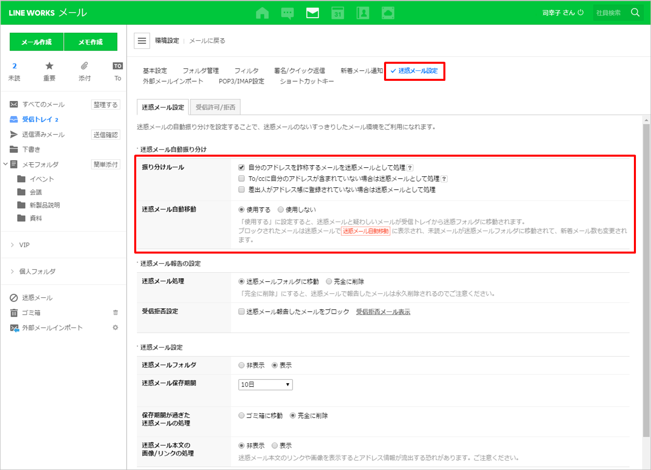 LINE WORKSを初めて利用する場合、迷惑メールの受信を防止するため、迷惑メール自動振り分けはデフォルトでオンになっています([環境設定>迷惑メール設定>迷惑メール自動移動])。
